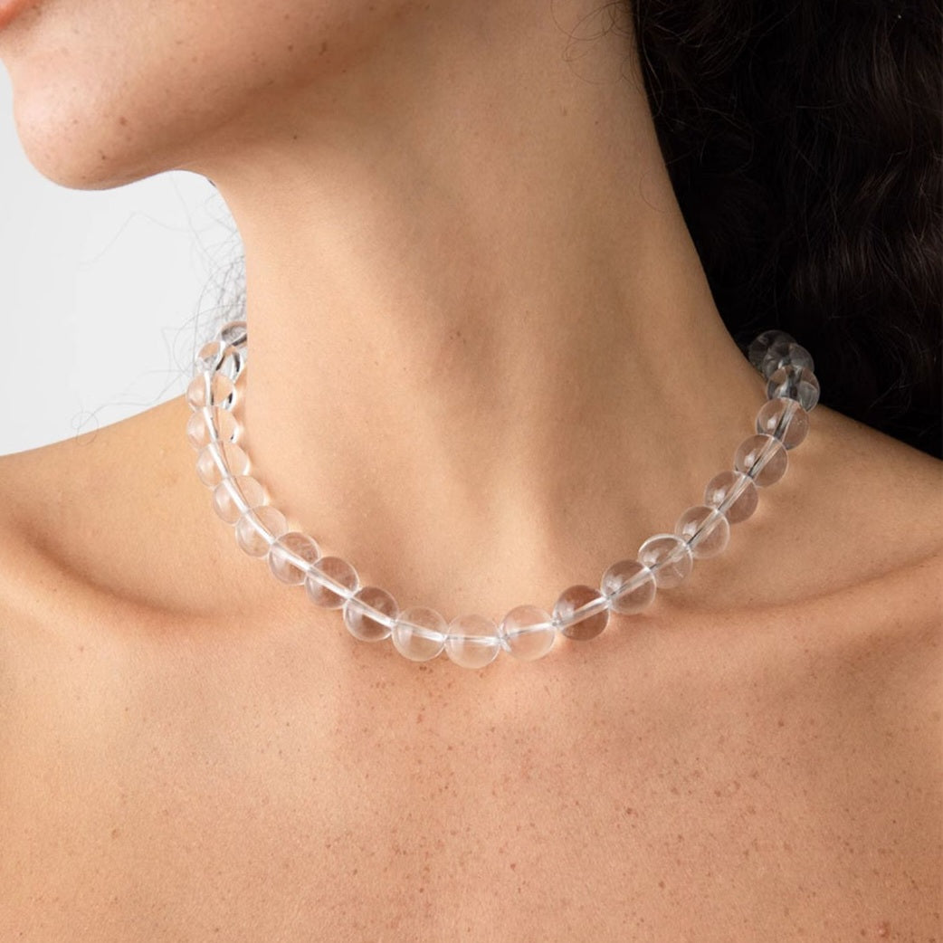Cool halskæde med store, gennemsigtige glasperler, der giver et rent og moderne look. Den lukkes nemt med en magnetlås i rustfrit ædelstål og sidder flot tæt om halsen. Halskæden måler 42 cm og perlerne er 12 mm – perfekt til både hverdag og et mere edgy outfit.