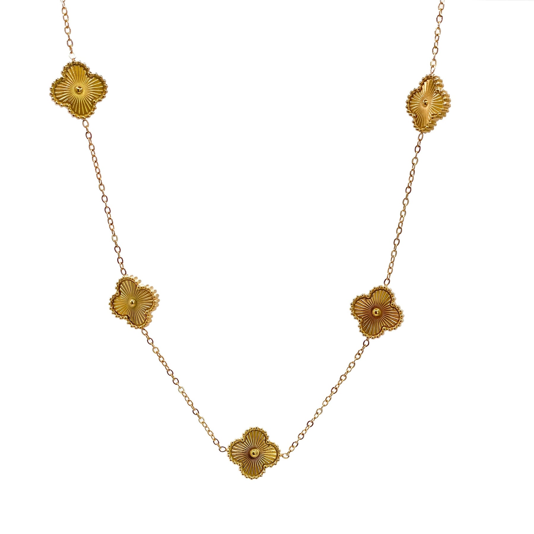 Feminin og iøjnefaldende halskæde med fem smukke firkløvervedhæng i 18kt forgyldt ædelstål. De fine detaljer og den gyldne glød giver et eksklusivt og heldbringende udtryk. Halskæden måler 40 + 5 cm, og hvert firkløver er 1,3 cm – perfekt til dig, der elsker et klassisk design med et moderne twist.