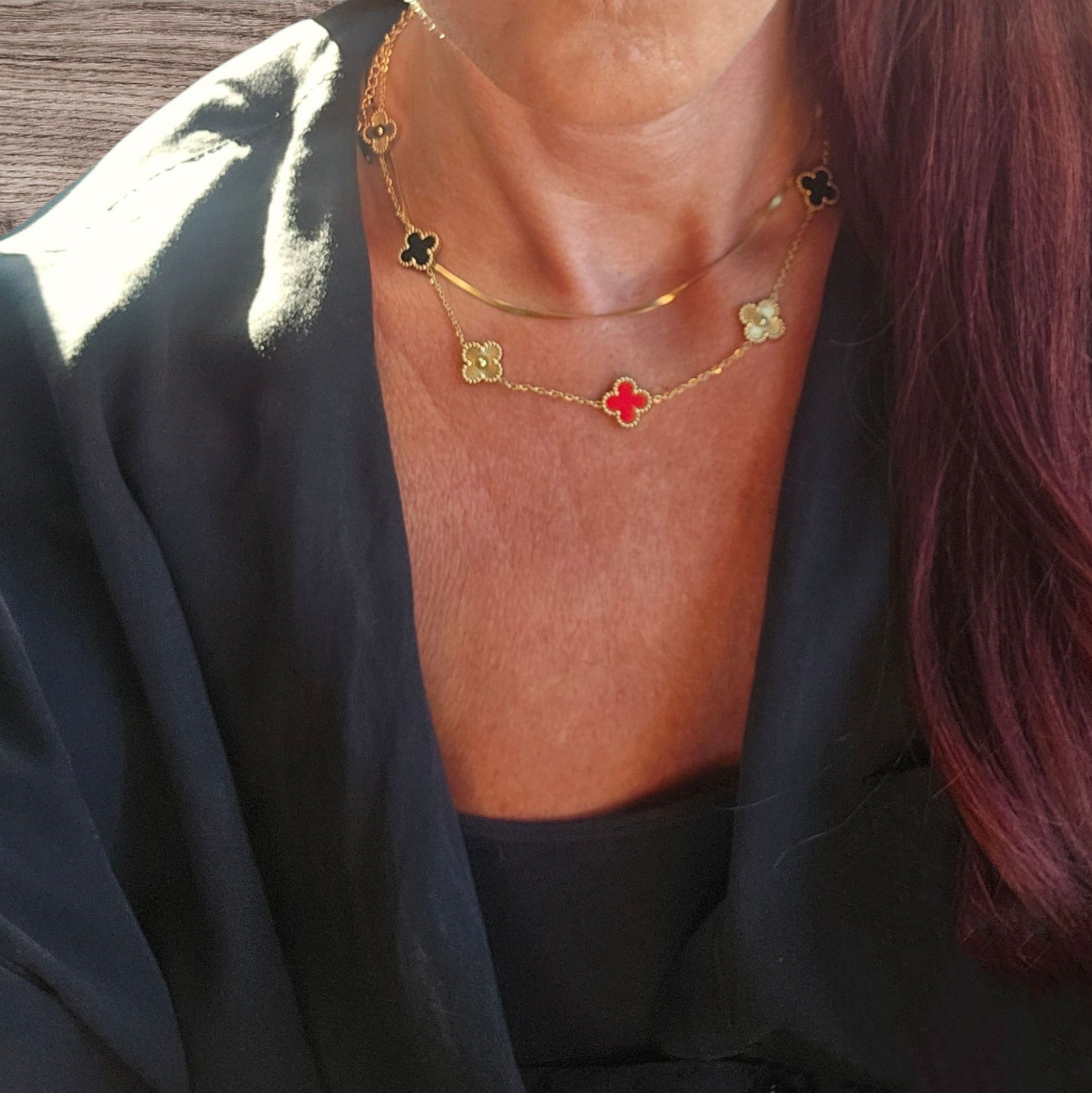 Unik firkløver-halskæde i 18 karat forgyldt rustfrit ædelstål med smukke kontraster i guld, sort og dybrød. De farvede og strukturerede vedhæng (1,5 cm) skaber et moderne og eksklusivt udtryk, der fanger blikket. Med en længde på 40 + 5 cm er den perfekt til at pifte ethvert outfit op – både til hverdag og fest.