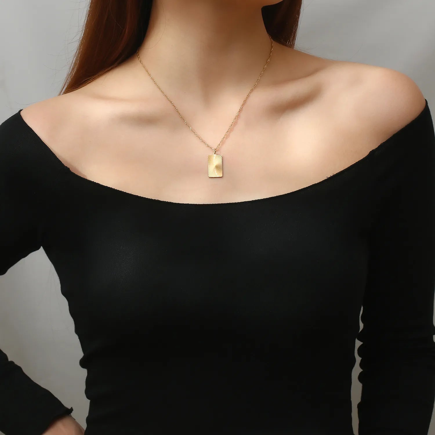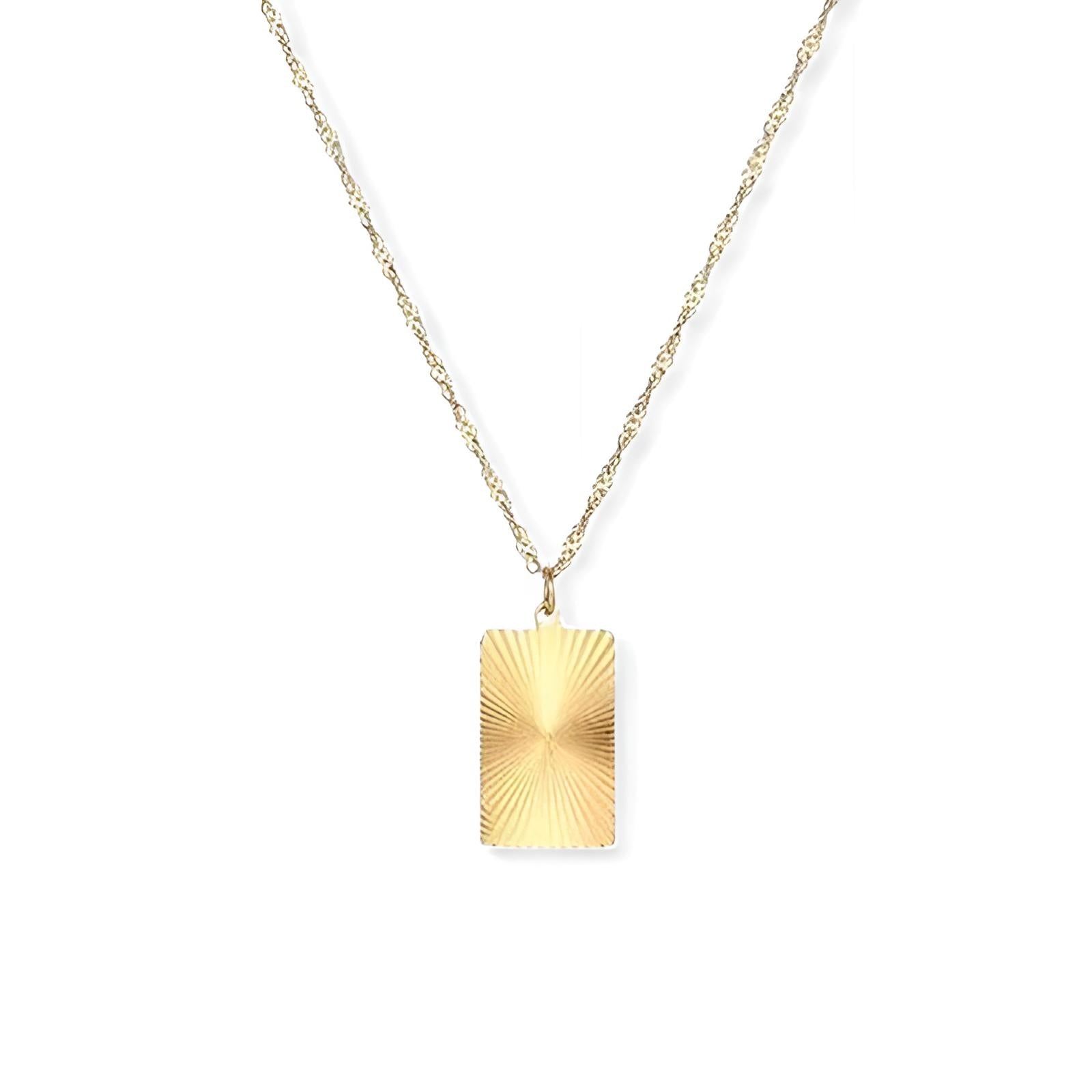 Elegant halskæde med et rektangulært vedhæng prydet med smukt solstråle-mønster. Fremstillet i 18kt. forgyldt rustfrit ædelstål med justerbar kæde, så den kan tilpasses dit look. Et stilrent smykke, der tilfører et eksklusivt touch til både hverdag og fest.