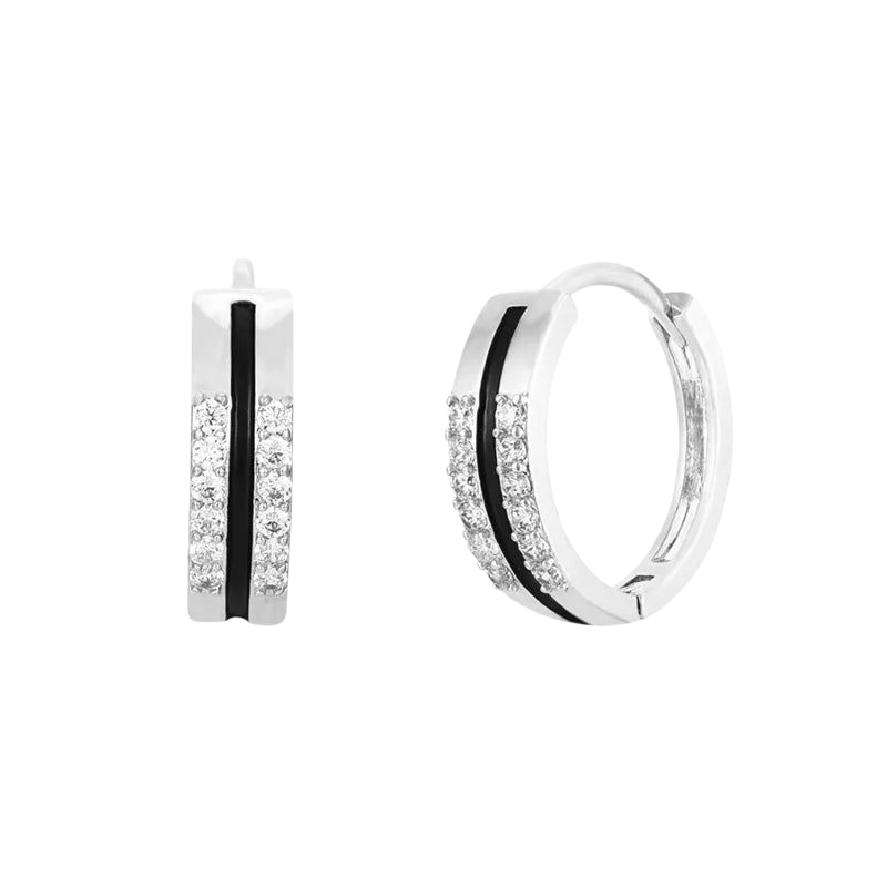 Designet fremhæves af en sort emaljedetalje i midten, som giver en smuk kontrast til de funklende klare zirkoner, der pryder begge sider. Resultatet er et par øreringe, der balancerer perfekt mellem sofistikeret og trendy.