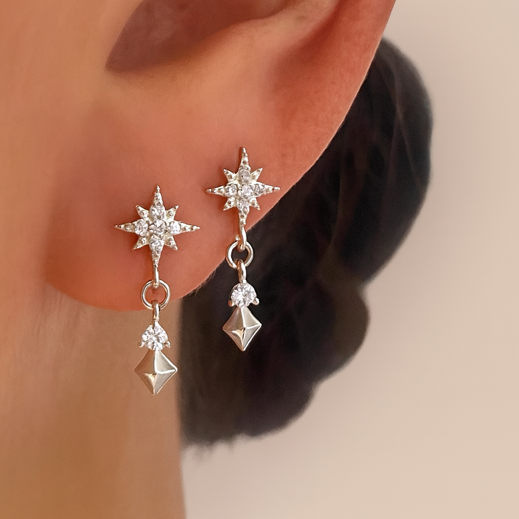 Tilføj et strejf af stjerneklar elegance til dit look med disse feminine og iøjnefaldende øreringe. Øreringene er designet med en funklende stjerneform, smukt besat med klare zirkoner, der glimter ved hver bevægelse. Under stjernen hænger en lille dråbeformet detalje, som giver øreringene et let og sofistikeret udtryk.