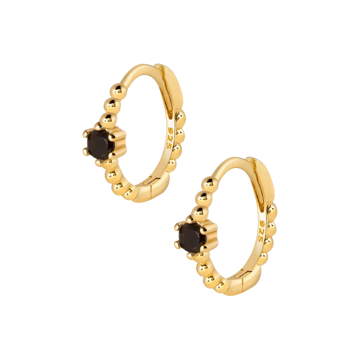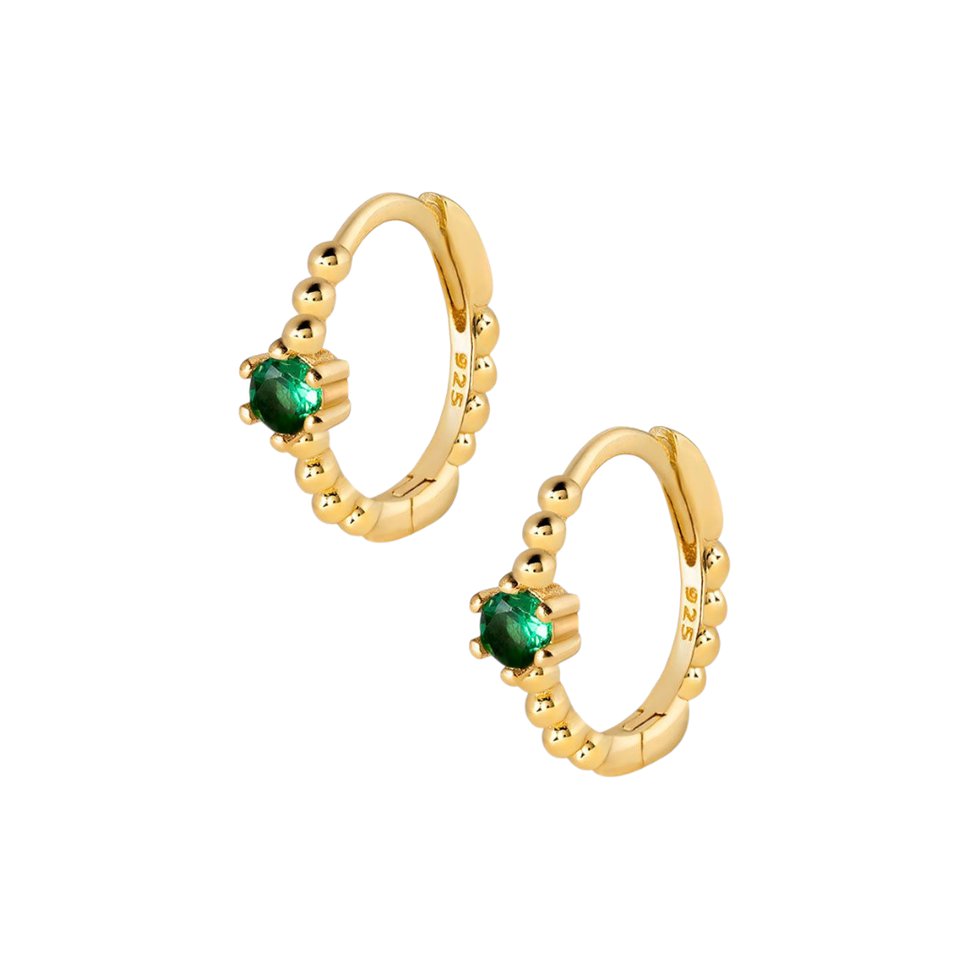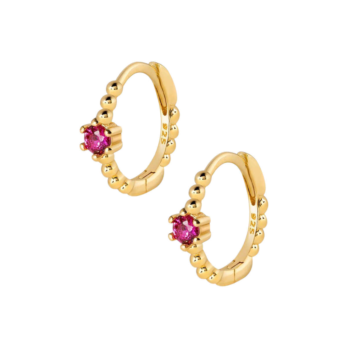 Smukke og feminine creoler i 18 karat forgyldt 925 Sterling sølv med en elegant kuglestruktur og farvet zirkon som midtpunkt. Øreringene måler 12 mm i ydre diameter og er 1,5 mm tykke – den perfekte størrelse til både førstehul og som en del af et mix i flere huller.