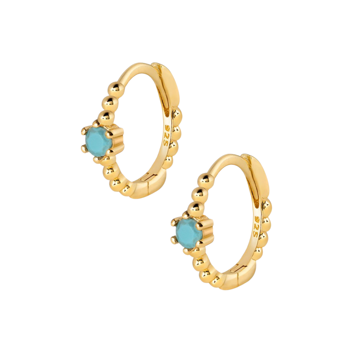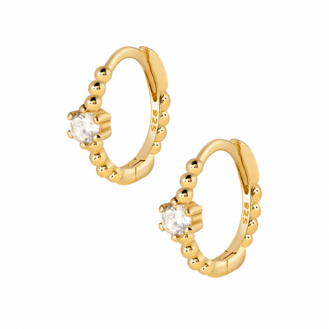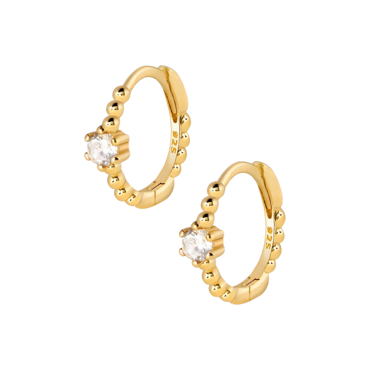 Smukke og feminine creoler i 18 karat forgyldt 925 Sterling sølv med en elegant kuglestruktur og farvet zirkon som midtpunkt. Øreringene måler 12 mm i ydre diameter og er 1,5 mm tykke – den perfekte størrelse til både førstehul og som en del af et mix i flere huller.