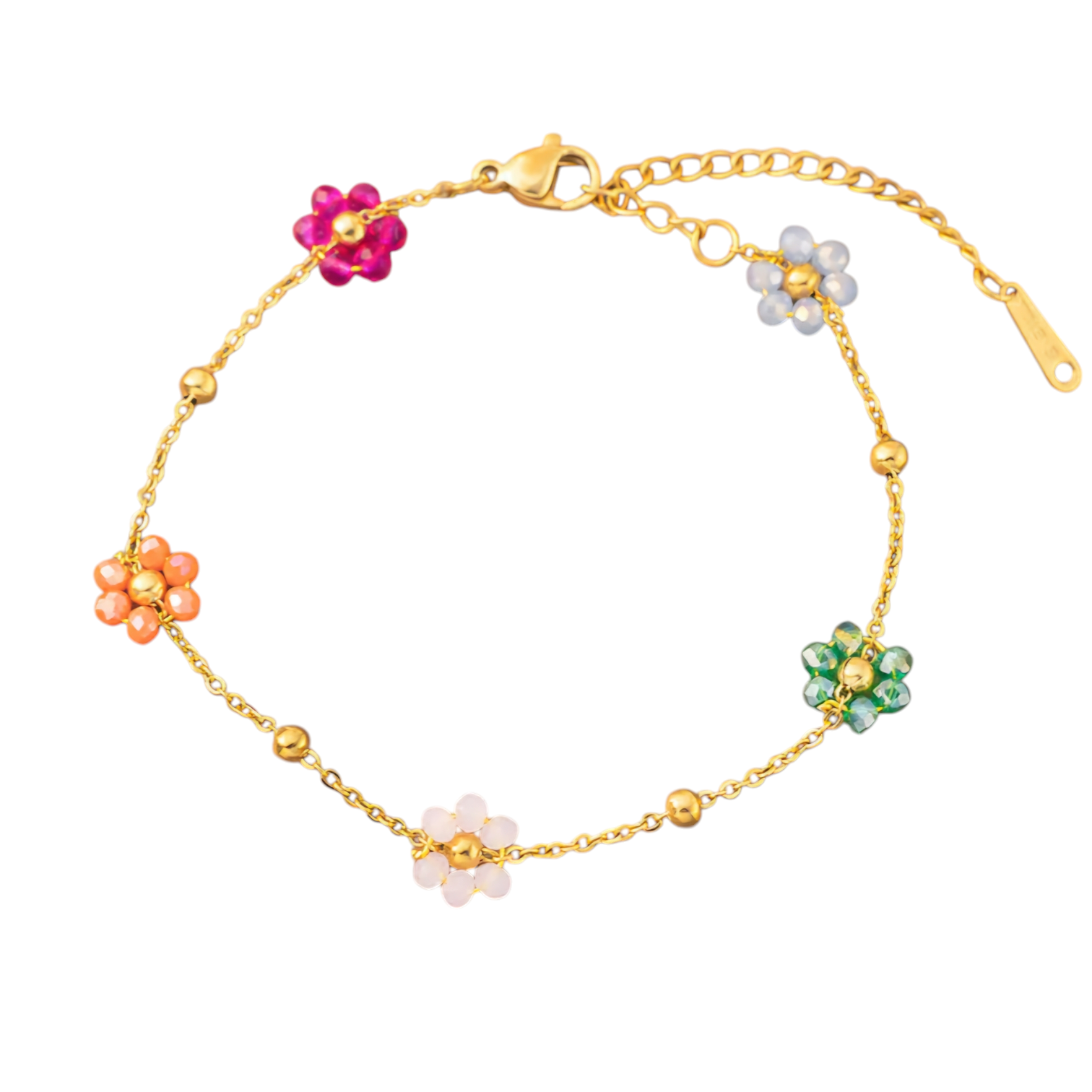 Dette elegante armbånd forener styrke og skønhed. Det er fremstillet af 18kt forgyldt titanium, hvilket gør det både let og yderst holdbart. Armbåndet er dekoreret med forskellige farvede blomster, der tilføjer et frisk og charmerende udtryk. Perfekt til at give dit look et feminint og stilfuldt touch. En ideel gave eller et unikt smykke til din egen kollektion. Tidssløst design og førsteklasses kvalitet!