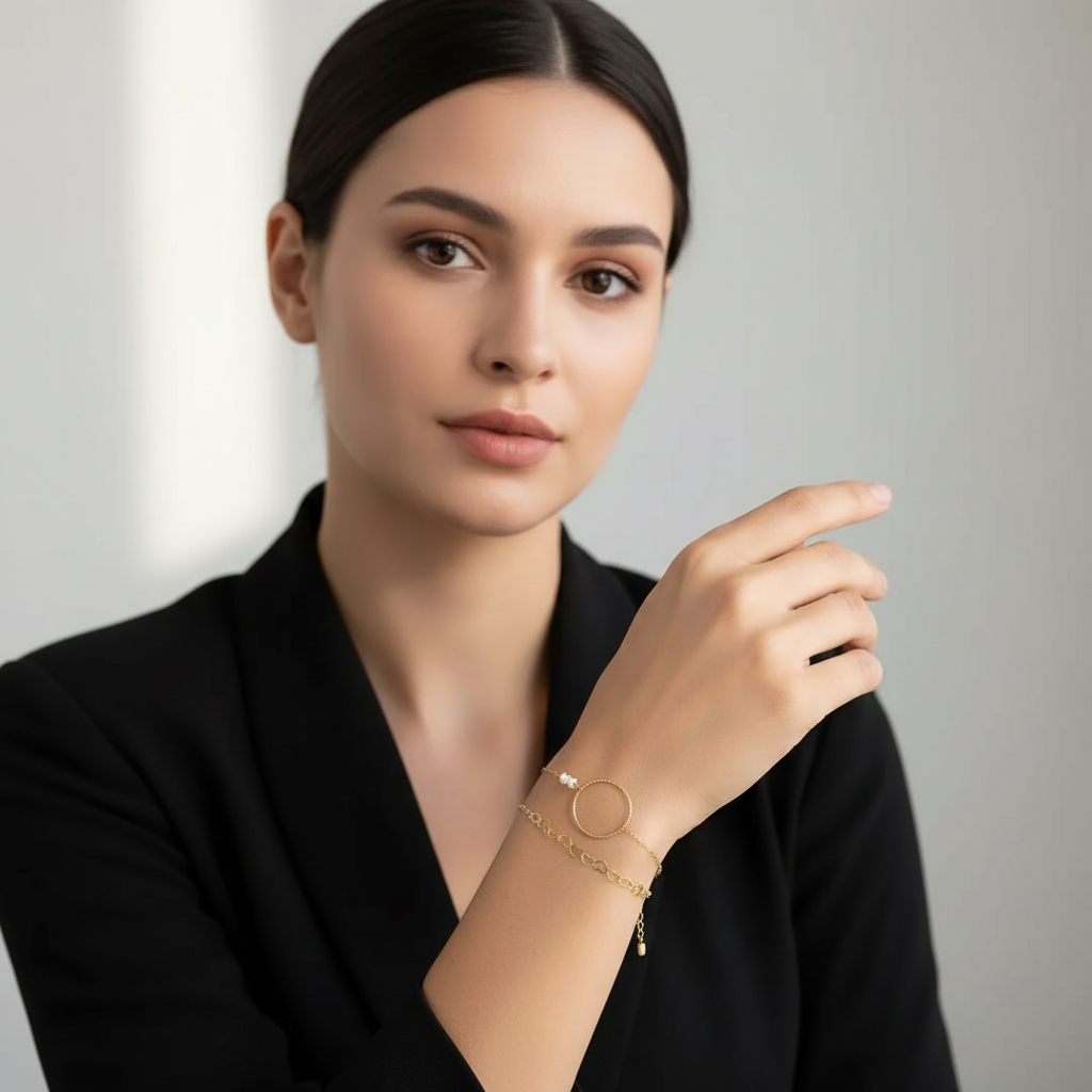 Tag skridtet ind i en verden af elegance med vores skønne armbånd, der er smykket med en cirkel. Dette fortryllende armbånd tilføjer et raffineret og tidløst touch til dit look. Uanset om du bærer den til festlige lejligheder eller som et elegant statement i hverdagen, vil det være en værdifuld tilføjelse til din smykkesamling. Lad dets perler fremhæve din naturlige skønhed og tilføre et strejf af klasse og stil.