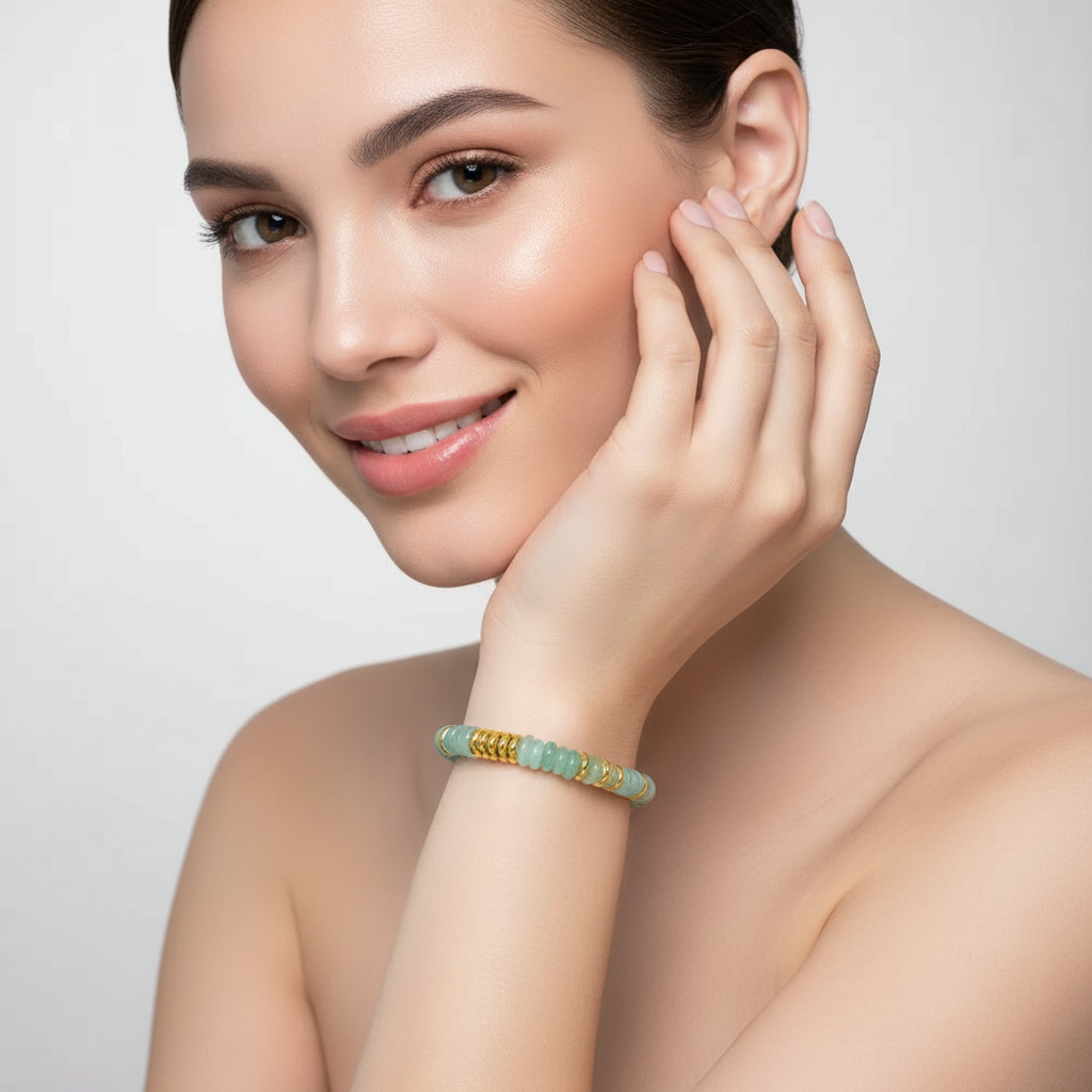 Et stilfuldt og harmonisk armbånd, designet med smukke grønne aventurasten, som siges at bringe held og indre ro. De naturlige sten skinner med en blid, grøn glans og tilføjer et frisk og balanceret udtryk til dit look.
