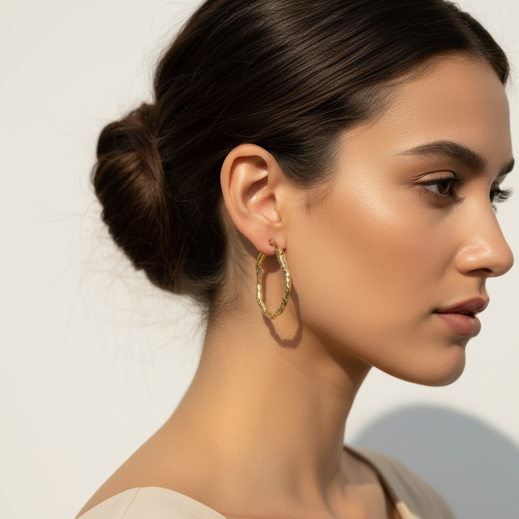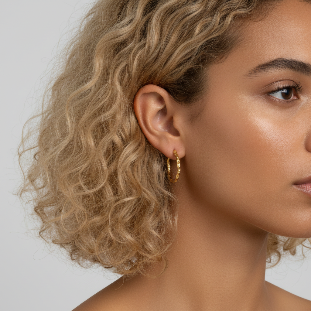 Disse hoops er udført i 18 karat forgyldt sterlingsølv, hvilket giver dem en luksuriøs og holdbar finish. De har en unik, irregulær overflade, som giver dem et råt og tekstureret udseende. Designet er bevidst asymmetrisk og skævt, hvilket tilføjer et moderne og kunstnerisk præg til smykket. Disse hoops er perfekte til dem, der ønsker at skille sig ud med et smykke, der er både elegant og anderledes.