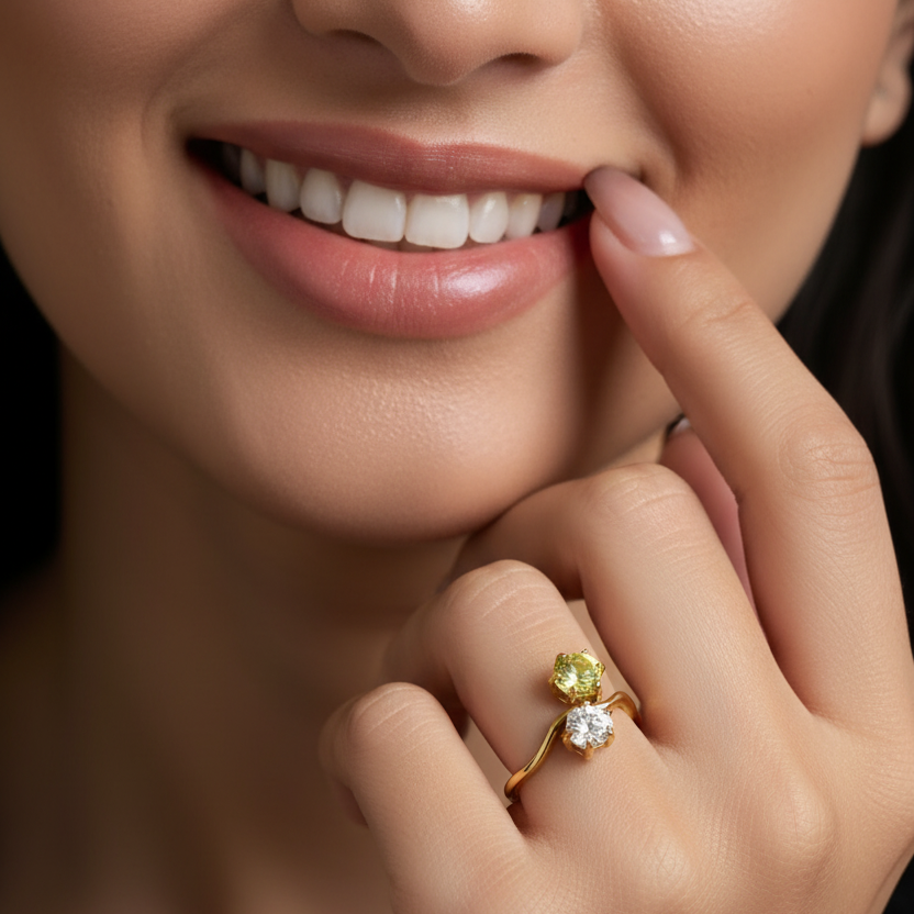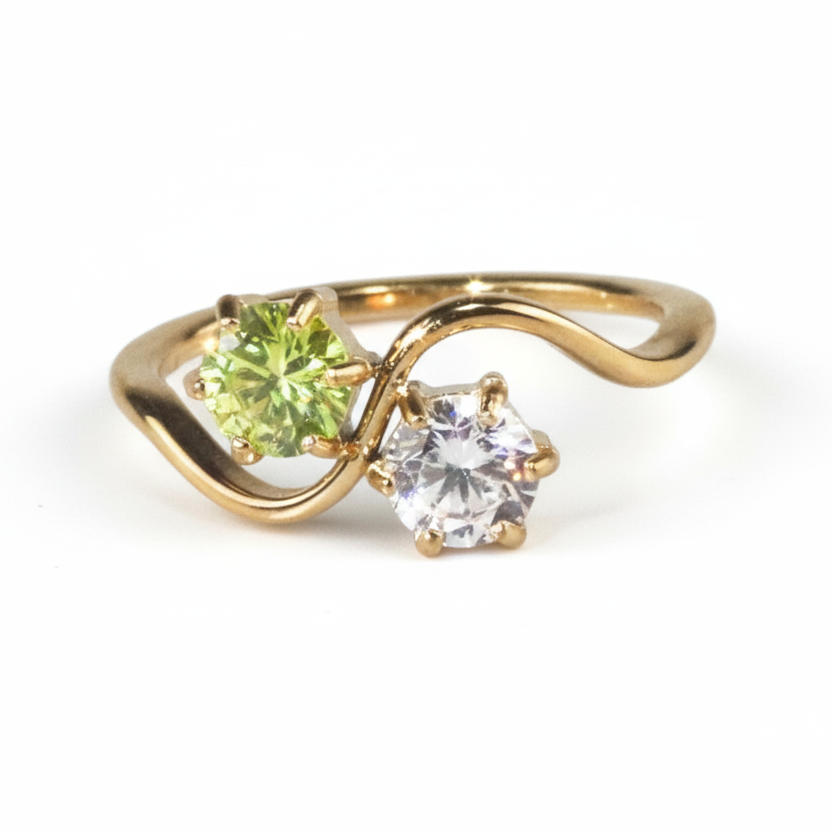 En stilfuld ring i 18kt. forgyldt ædelstål med to funklende zirkoner i klar og grøn nuance. Det åbne, bølgede design giver et moderne og feminint udtryk, som skiller sig ud uden at være for meget. Brug den alene som statement eller kombiner med dine andre ringe for et personligt touch.