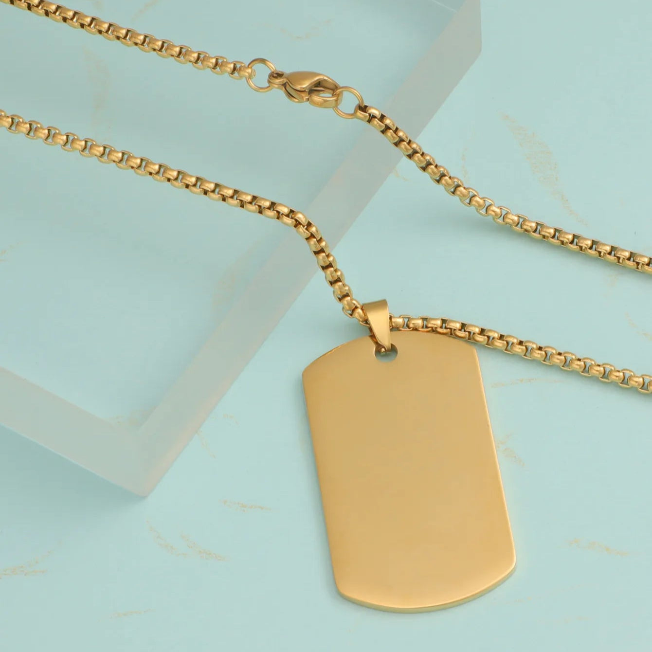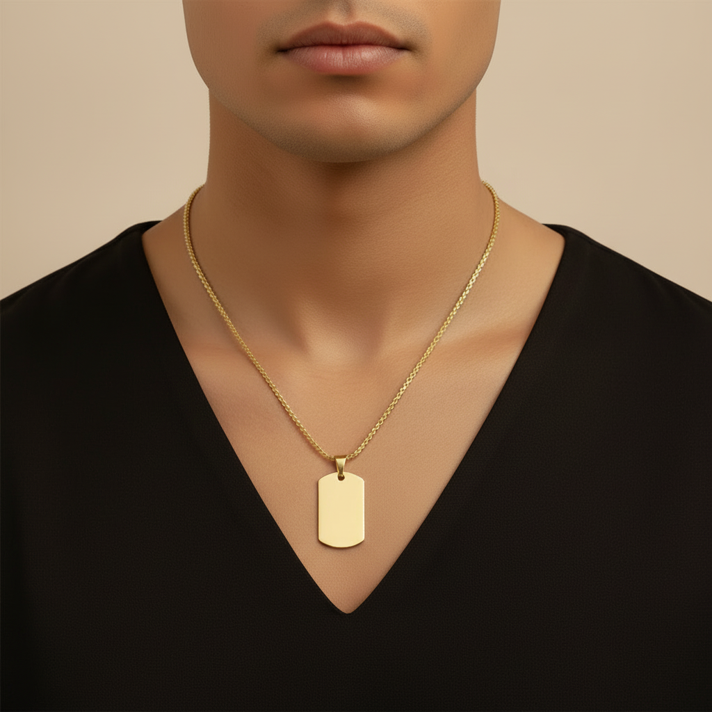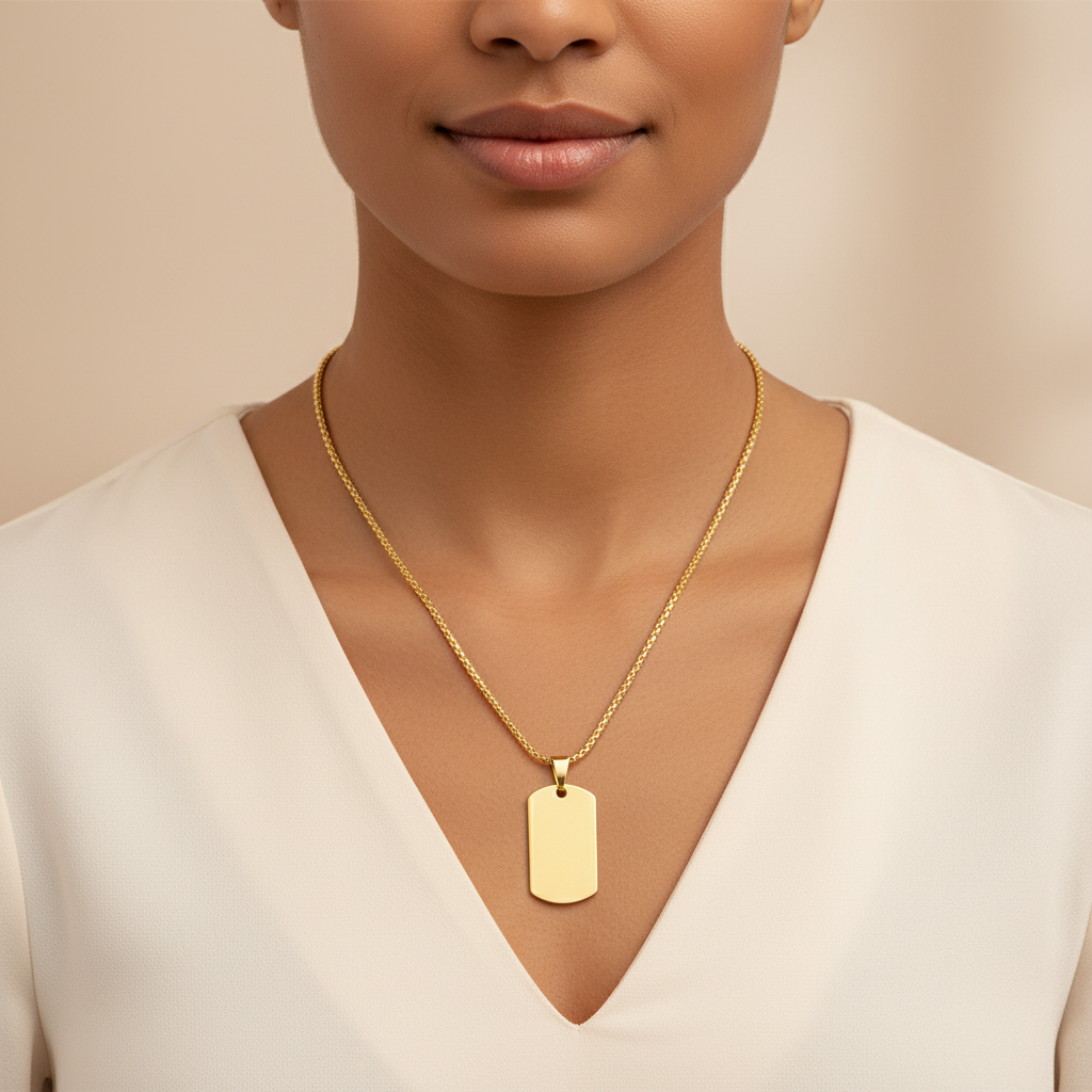 Enkel og cool dog tag halskæde i 18 karat forgyldt rustfrit ædelstål – perfekt til både hverdag og statement looks. Den blanke overflade giver et stilrent udtryk og kan nemt personliggøres med indgravering. Vandfast og slidstærk, så du kan bruge den igen og igen uden bekymringer