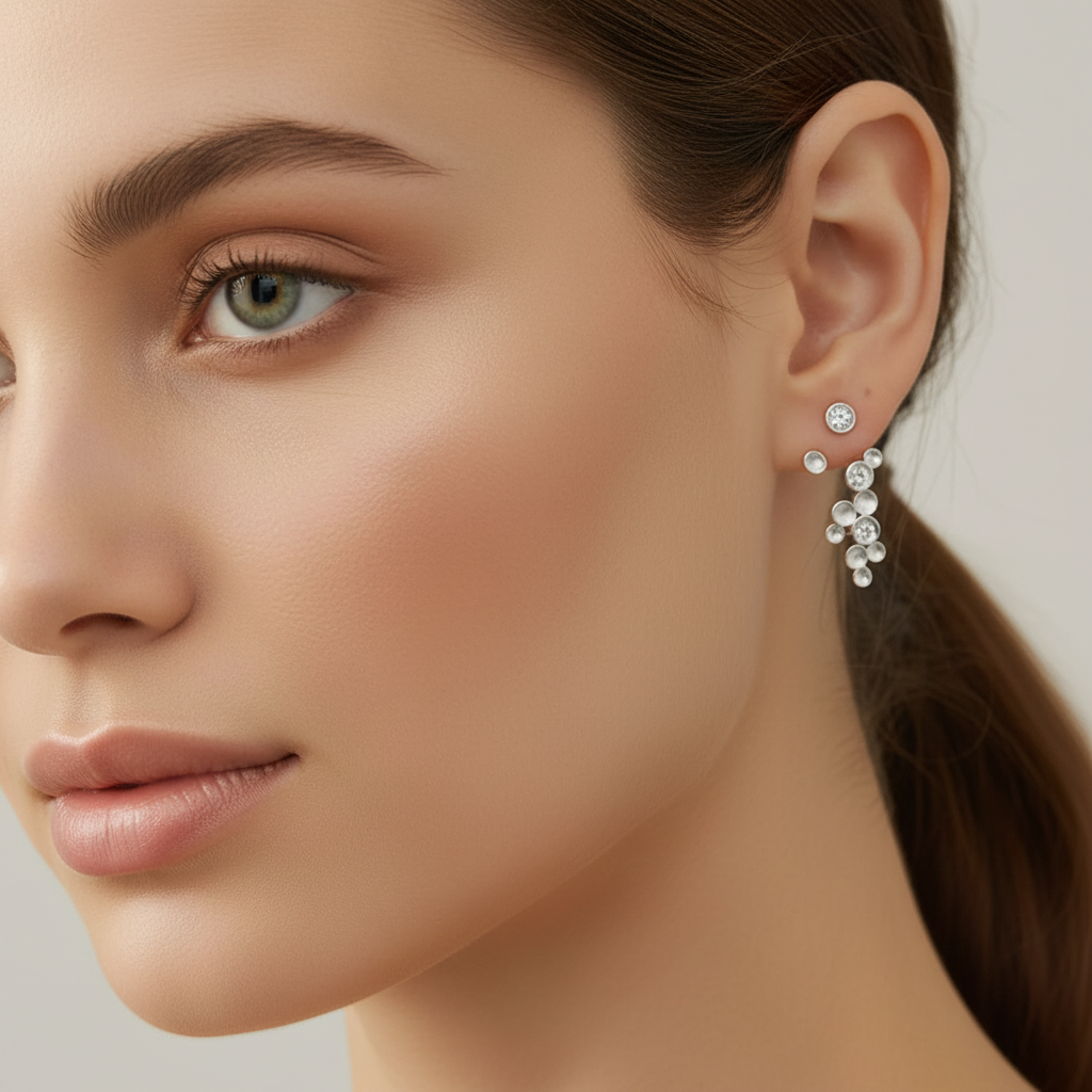 Unikke ørestikker i forsølvet kobber prydet med funklende zirkoner. Det legende boble-design giver et let og elegant udtryk, der fanger lyset smukt. Perfekte til at løfte både hverdags- og festlooket med et strejf af glamour.