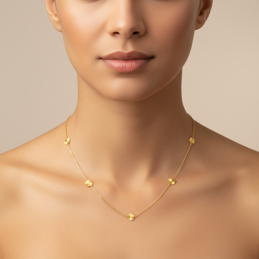 En feminin og elegant halskæde prydet med små femkløvere langs kæden – perfekt til dig, der elsker et let og sofistikeret udtryk. De fine blomster reflekterer lyset smukt og giver et delikat gyldent skær, der passer både alene og i lag med andre kæder.