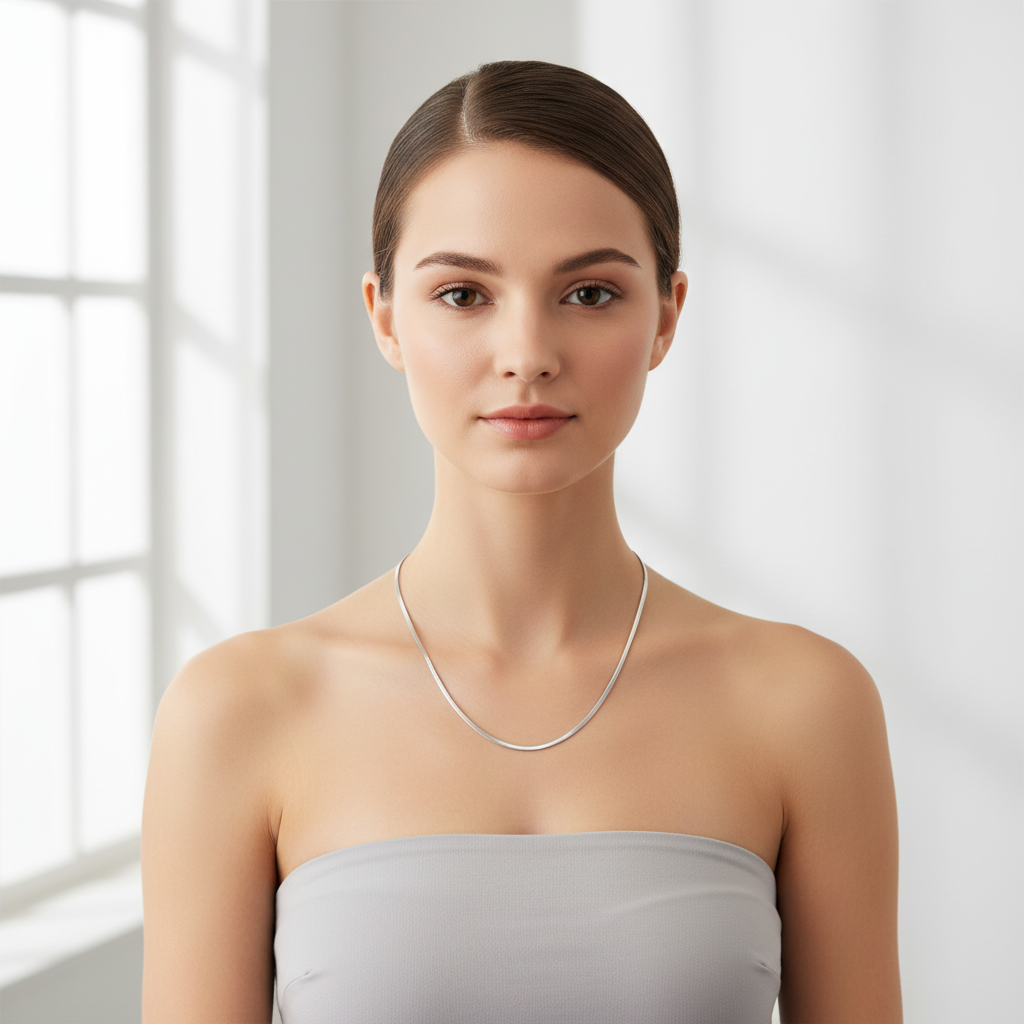 En klassisk og tidløs halskæde i blankpoleret ædelstål med en smuk, flad slangekæde på 2 mm. Perfekt som et enkelt statement eller til at kombinere med andre kæder for et personligt look. Vælg mellem 40 eller 45 cm plus 5 cm forlængerkæde for fleksibel styling.