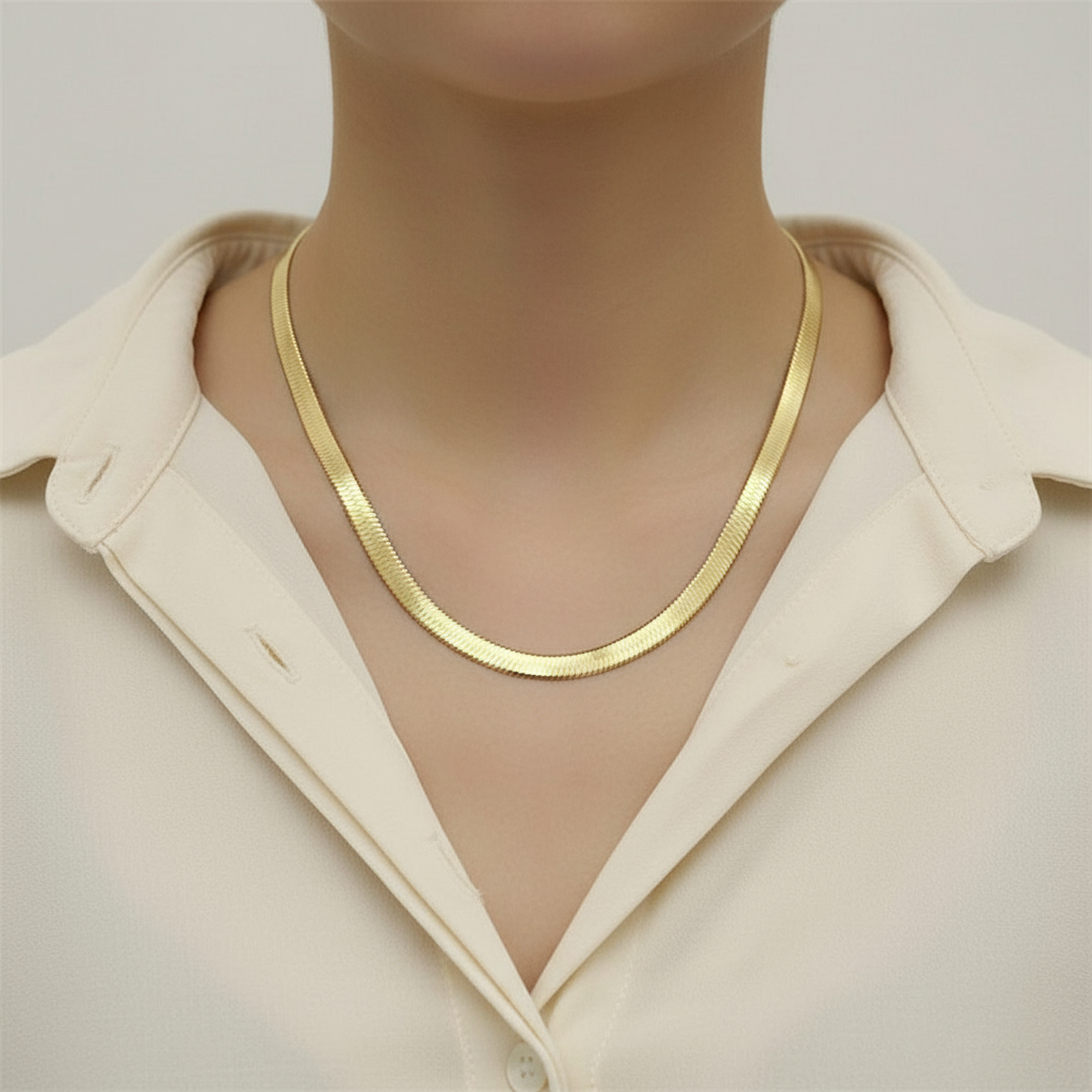 Opnå en elegant og stilfuld fremtoning med vores flade slangehalskæde. Denne halskæde er lavet af holdbart 14kt. forgyldt rustfrit stål med en imponerende bredde på 6mm. Du kan vælge mellem tre forskellige længder: 40cm og 50 cm. hver med en ekstra 5 cm forlænger for at tilpasse den perfekt til din stil. Et smykke, der kombinerer klassisk design med moderne flair og passer til enhver anledning.