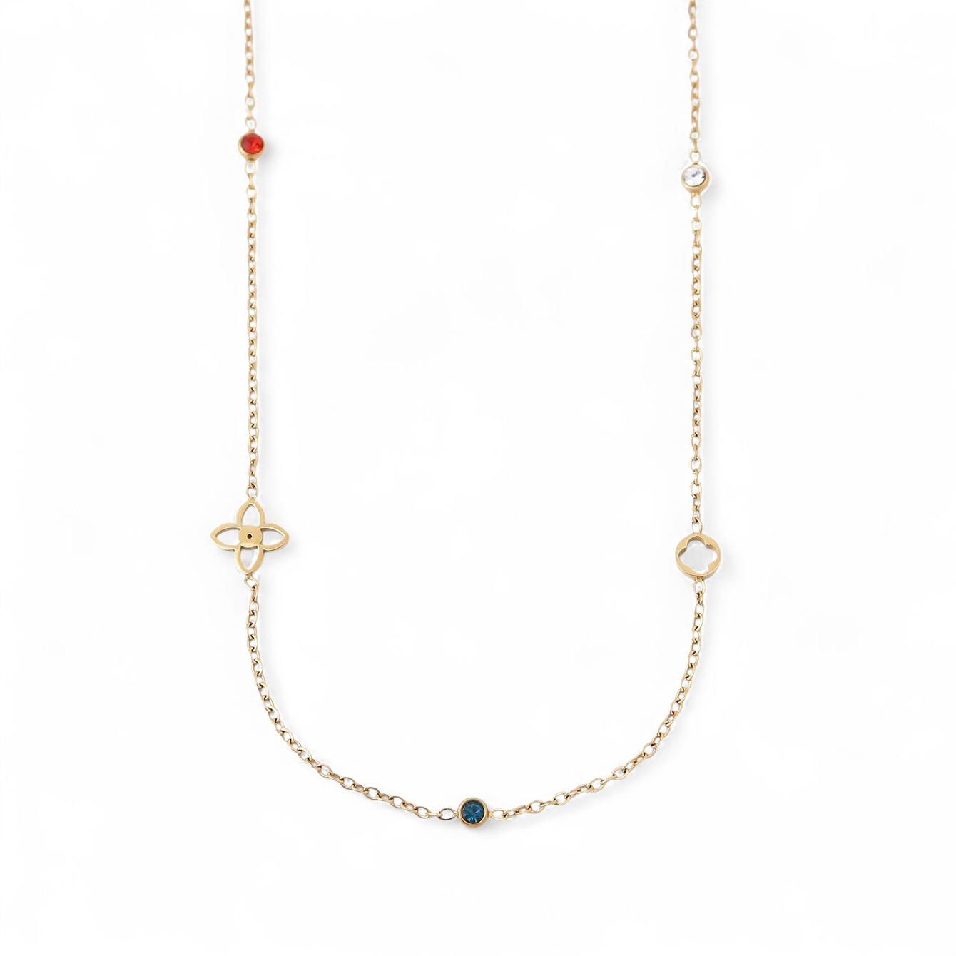 Elegant og tidløs – denne smukke halskæde i 18kt forgyldt ædelstål er designet til at give dit look et feminint og farverigt twist. Kæden prydes af fine detaljer med geometriske former og små farvede sten, som skaber et legende, men stadig stilrent udtryk.