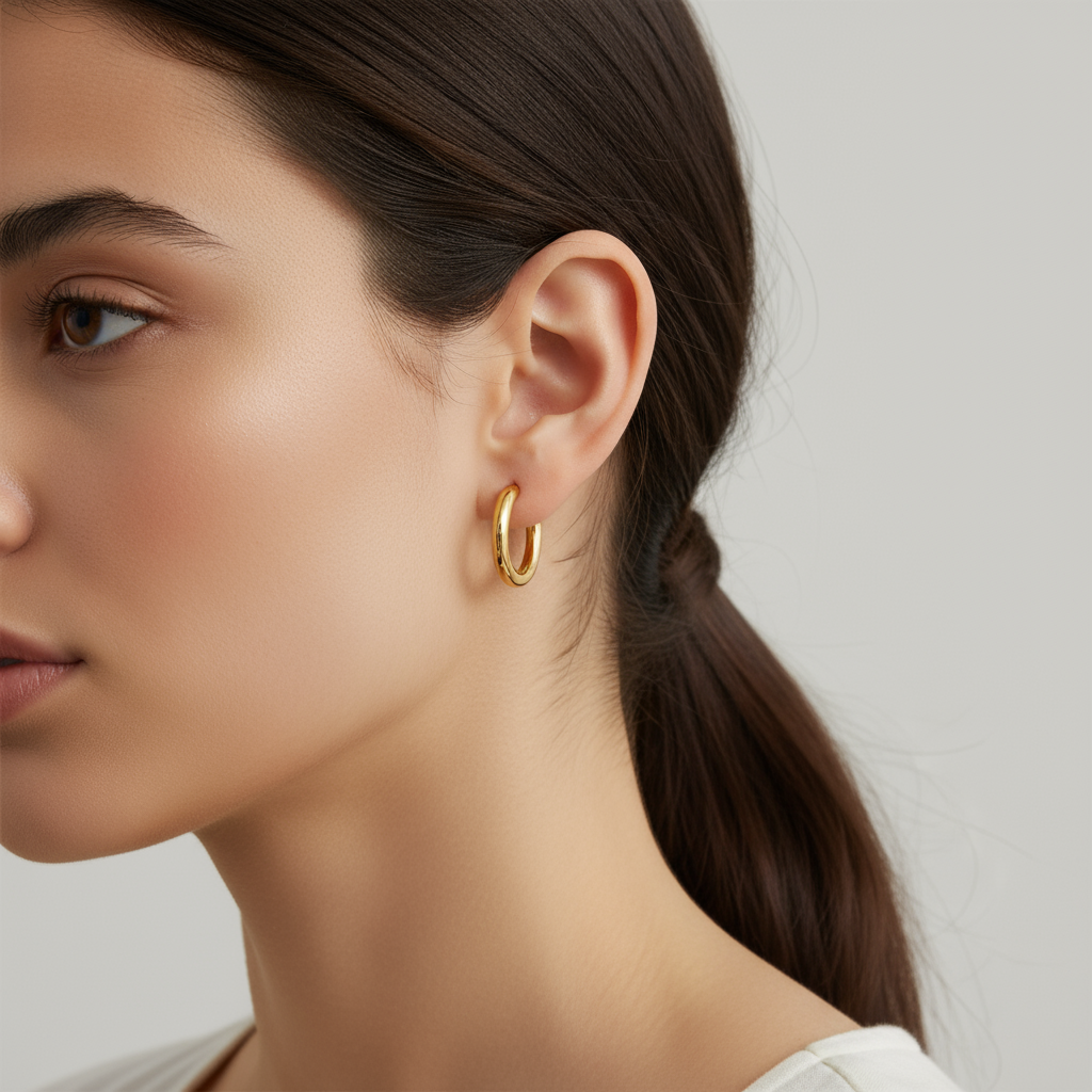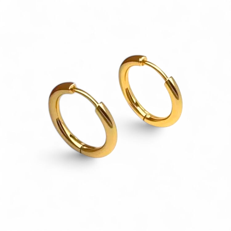 Klassiske og tidløse hoop øreringe i 18 karat forgyldt titanium – perfekte til både hverdag og fest. Øreringene er fremstillet i allergivenligt, nikkelfrit titanium, som er kendt for sin lette vægt, styrke og holdbarhed. Den skinnende guldoverflade giver et elegant og minimalistisk udtryk, der passer til enhver stil.