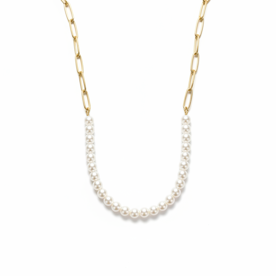 Link halskæde med ferskvands perler i 18 karat forgyldt titanium