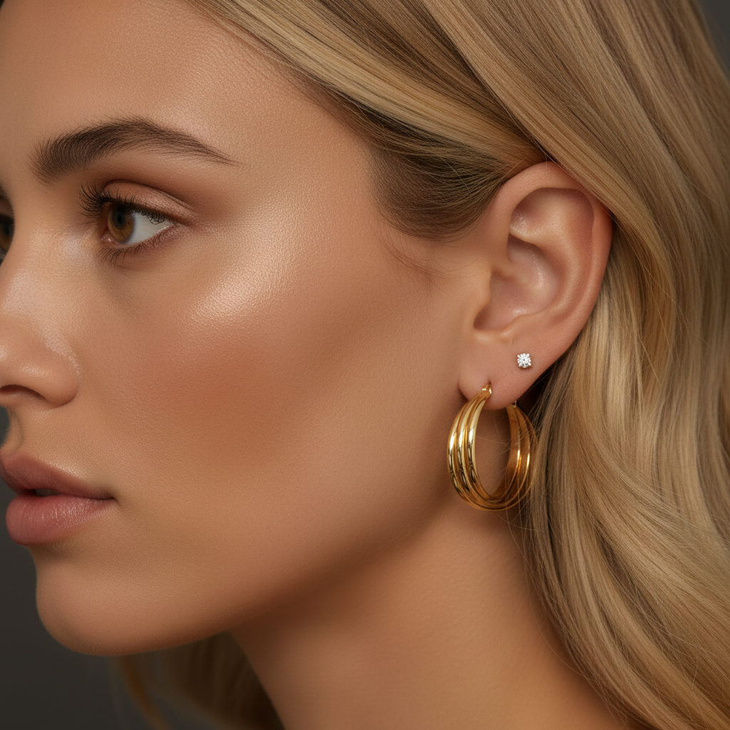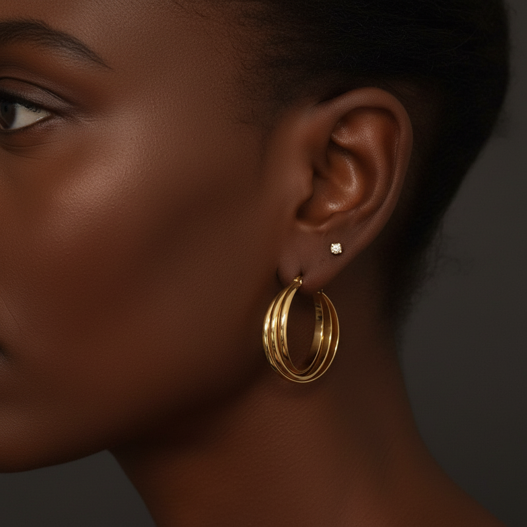 Disse smukke hoops er designet med tre bløde, bølgende lag, der giver et eksklusivt og fyldigt udtryk – uden at blive tunge at bære. Den varme guldfarve og det blankpolerede finish gør dem perfekte både til hverdag og til særlige lejligheder.