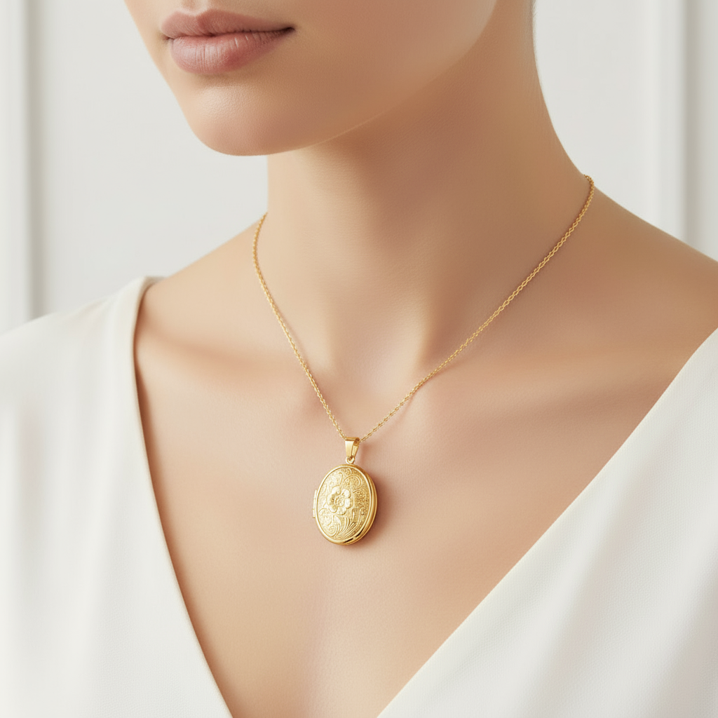 En tidløs og romantisk medaljon med smukke, indgraverede blomsterdetaljer. Det ovale design åbner sig og giver plads til to små billeder – perfekt til at bære minderne tæt på hjertet.