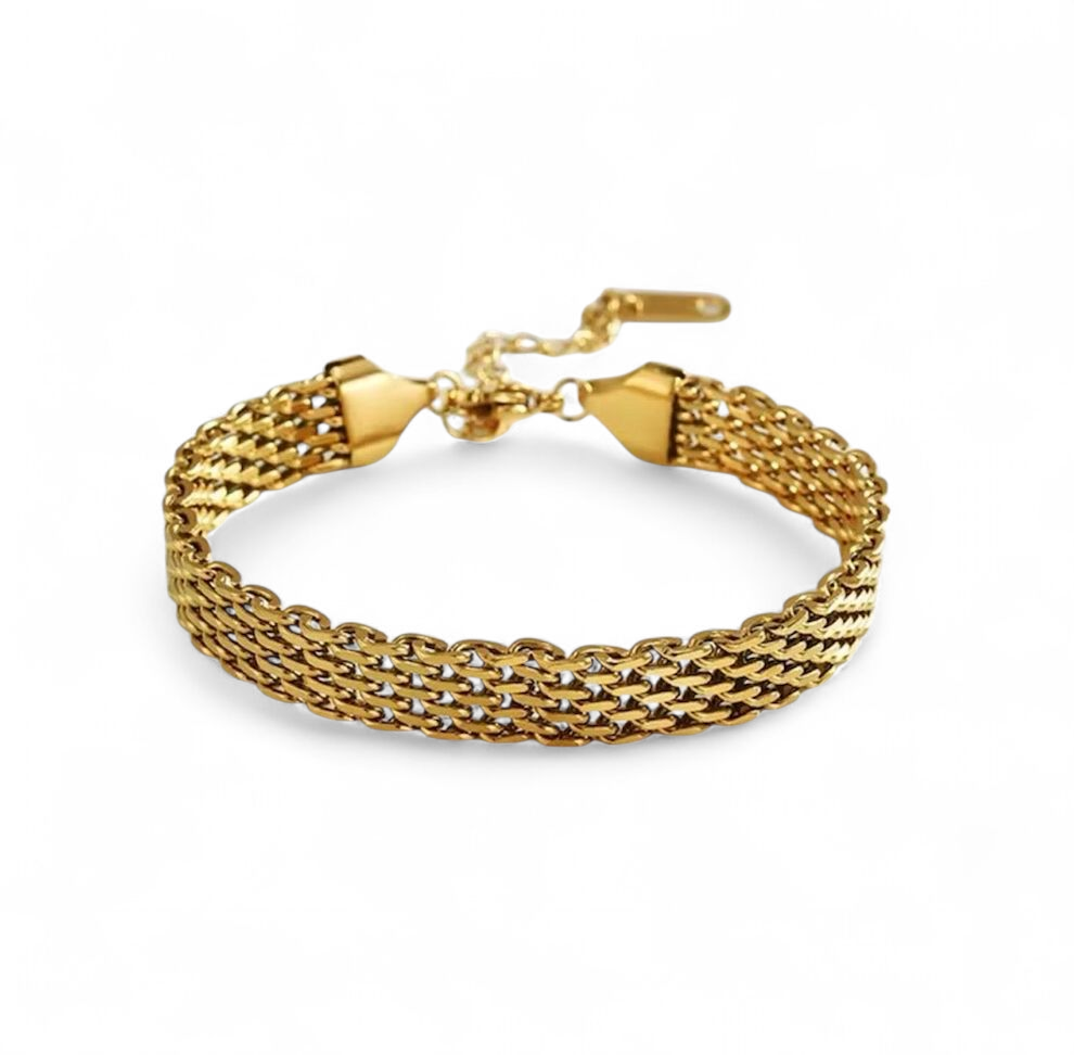 Et elegant og tidsløst armbånd med flettet kædestruktur, der giver et eksklusivt og sofistikeret udtryk. Den brede kæde (8 mm) fanger lyset smukt og tilføjer et strejf af luksus til ethvert outfit – perfekt både til hverdag og fest.