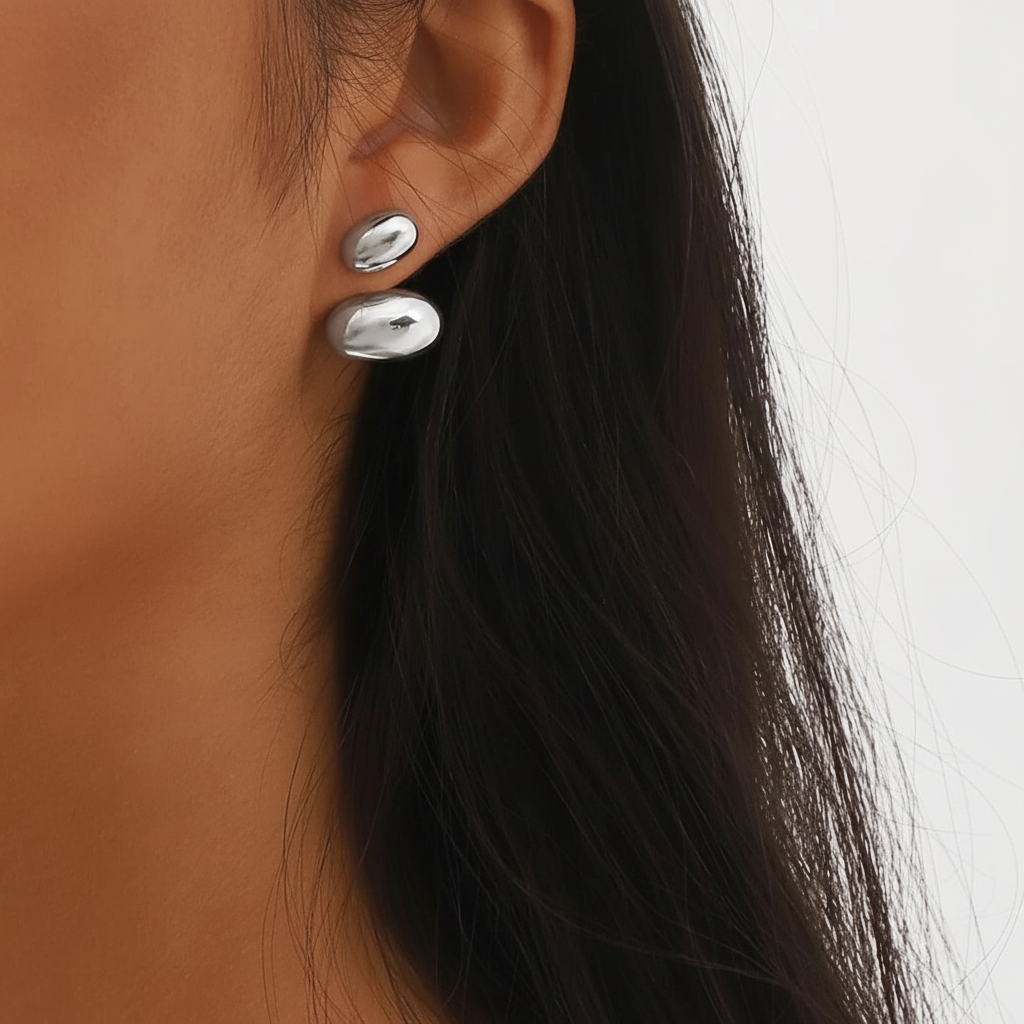 Moderne ørestikker i blankt rustfrit ædelstål med organiske, afrundede former. De dobbelte former giver et skulpturelt udtryk, som er både stilrent og iøjnefaldende. Perfekte til dig, der elsker et minimalistisk look med kant.