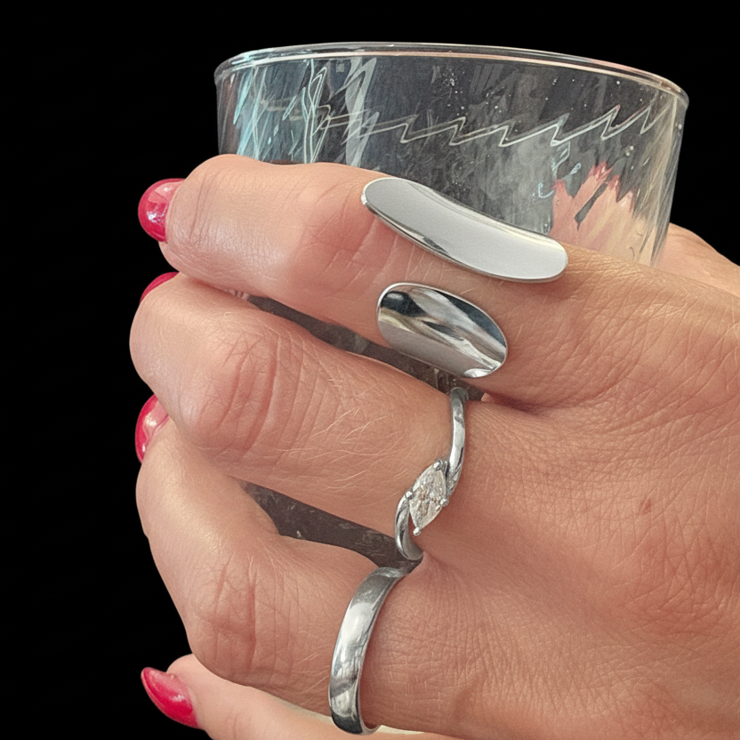 Elegant og moderne ring i ædelstål med et unikt, organisk design. Ringen er justerbar fra str. EU 55, så den tilpasses nemt din finger. Perfekt til både hverdag og festlige anledninger – et stilrent statement, der skiller sig ud.
