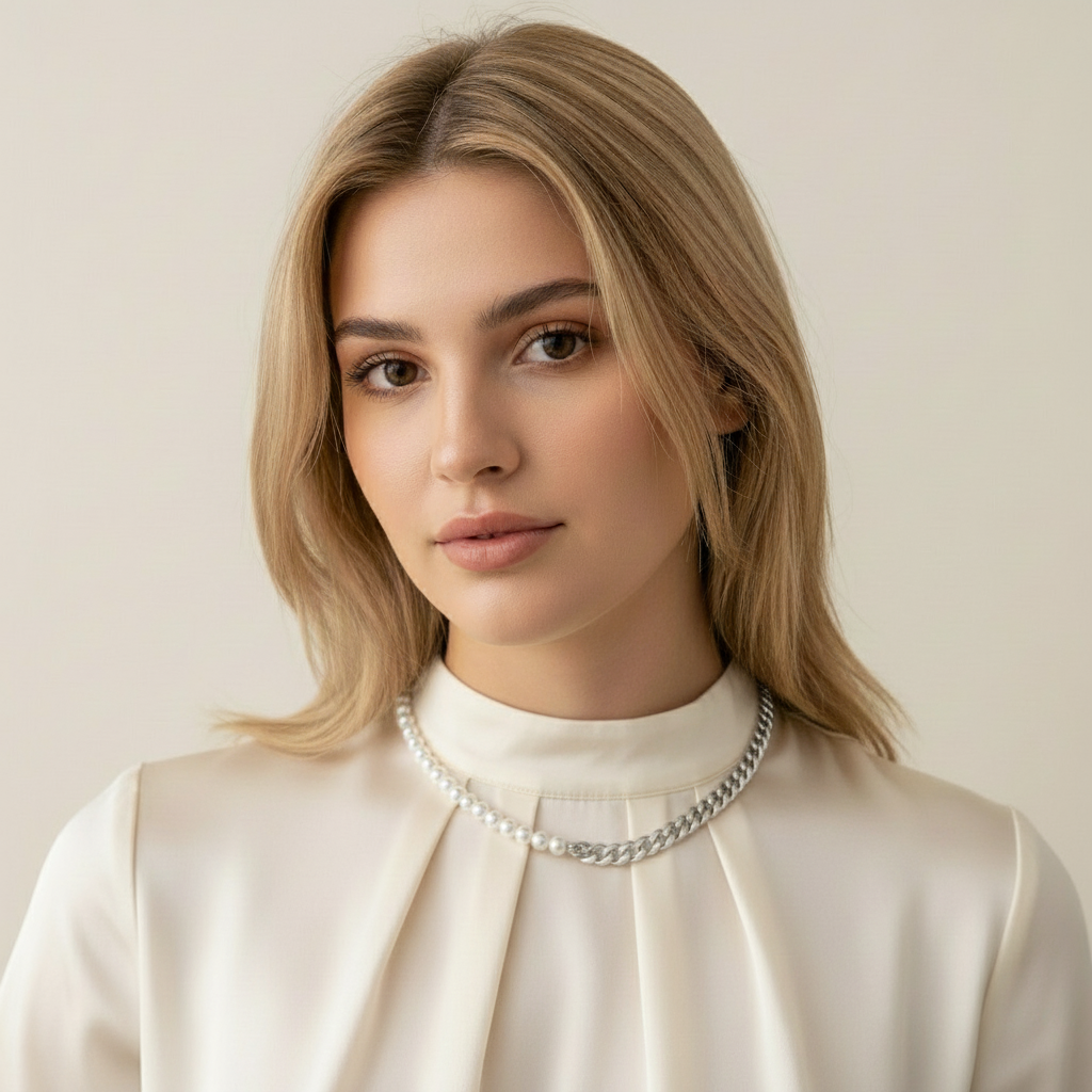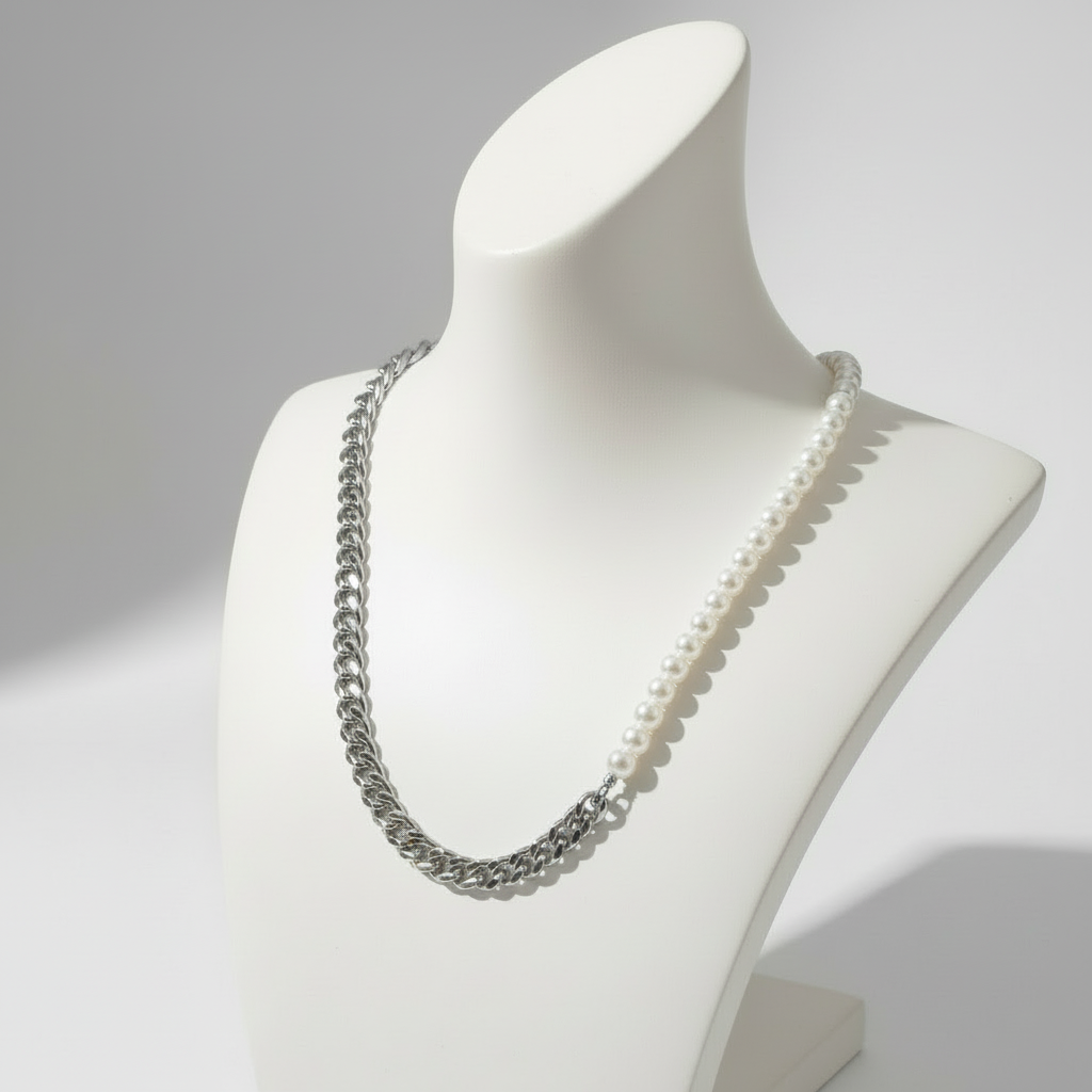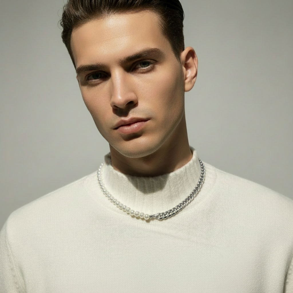 Kontrasten mellem det kølige stål og de bløde perler skaber et unikt statement-look, som passer perfekt til både mænd og kvinder – uanset om det er til hverdag eller fest.