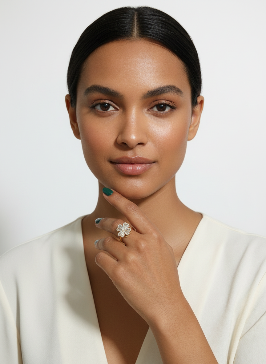 Vores fidget antistress hjerte firkløver ring stråler med sine smukke farver. En smuk antistress ring med en firkløver, du kan spinne med. Både smuk, og nem at dimse med. Skabt af holdbart 18kt. forgyldt kobber og med en justerbar størrelse, er denne ring en symbolsk og smuk tilføjelse til din smykke samling. Lad solens glød og zirkonernes glans lyse op i din hverdag.