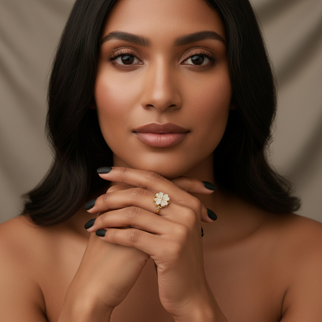 Vores fidget antistress firkløver ring stråler med sin smukke glans. En smuk antistress ring med en firkløver, du kan spinne med. Både smuk, og nem at dimse med. Skabt af holdbart 18kt. forgyldt kobber og med en justerbar størrelse, er denne ring en symbolsk og smuk tilføjelse til din smykke samling. Lad solens glød og zirkonernes glans lyse op i din hverdag.