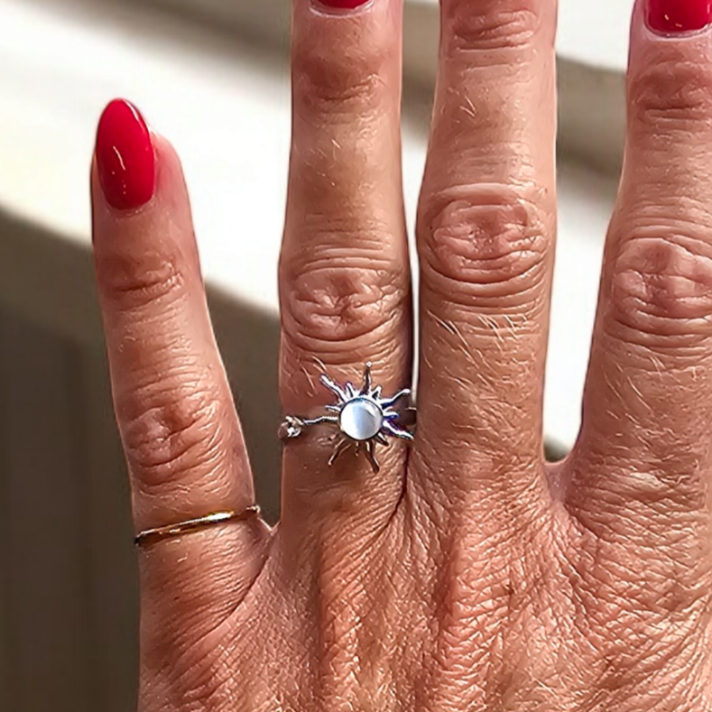 Vores fidget antistress solring stråler med en lille sol, hvor midten er prydet med en skinnende soft pink opalsten. En smuk antistress ring med en sol, du kan "dimse" med. Både smuk, og nem at dimse med. Skabt af forsølvet kobber og med en justerbar størrelse, er denne ring en symbolsk og smuk tilføjelse til din smykke samling. Lad solens glød og opalens glans lyse op i din hverdag.