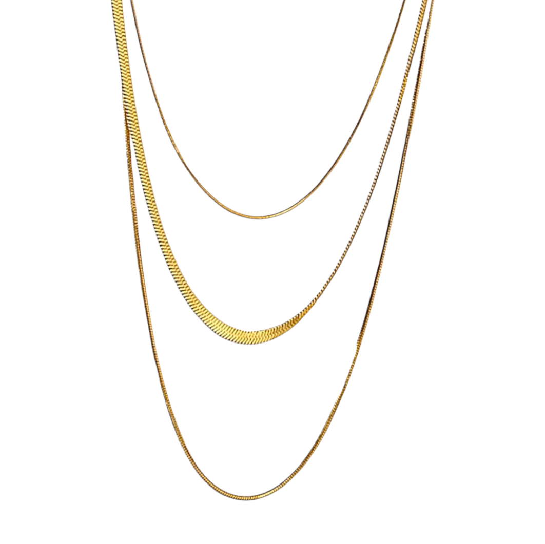 Halskæde 3 lags med runde og flad slangekæde i 14 karat forgyldt ædelstål