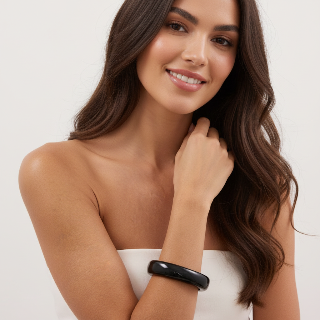 Elegant bangle i resin med sort marmoreret mønster. Den unikke, organiske form giver et moderne twist til dit look. Måler 65 mm i diameter – perfekt til at bære alene eller kombinere med andre armbånd for et personligt udtryk.