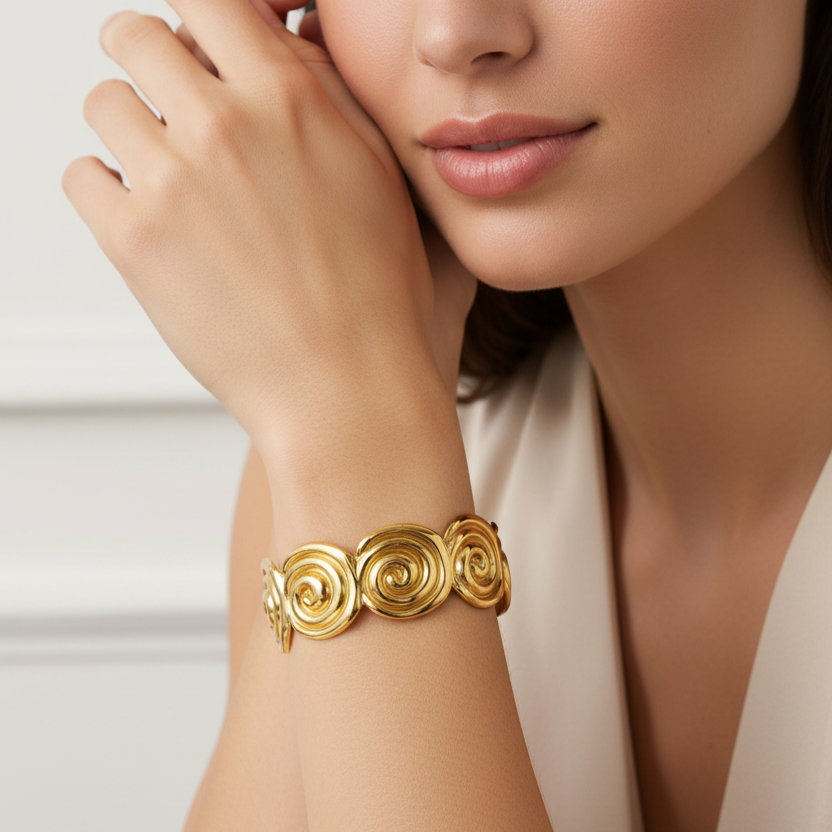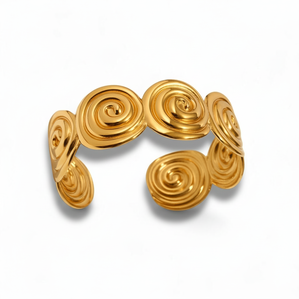 Iøjnefaldende armring fremstillet i 18 karat forgyldt ædelstål. Designet består af smukke, lukkede snoede spiraler, der reflekterer lyset og giver et eksklusivt og moderne udtryk. Armringen er justerbar, så den nemt kan tilpasses håndleddet for en behagelig pasform.