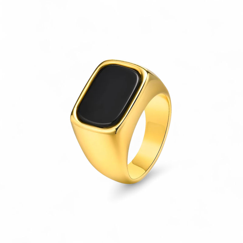 Denne ring udstråler styrke og stil med sit markante design og dybe sorte sten i firkantet form. Ringen er fremstillet i slidstærkt ædelstål og belagt med 18 karat guld, hvilket sikrer både holdbarhed og en smuk, varm finish.
