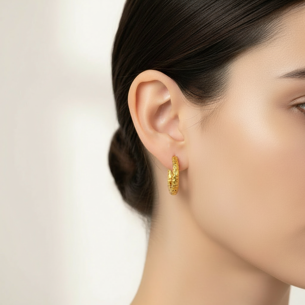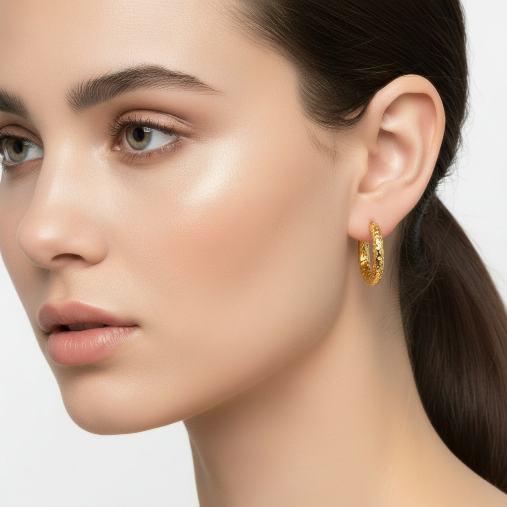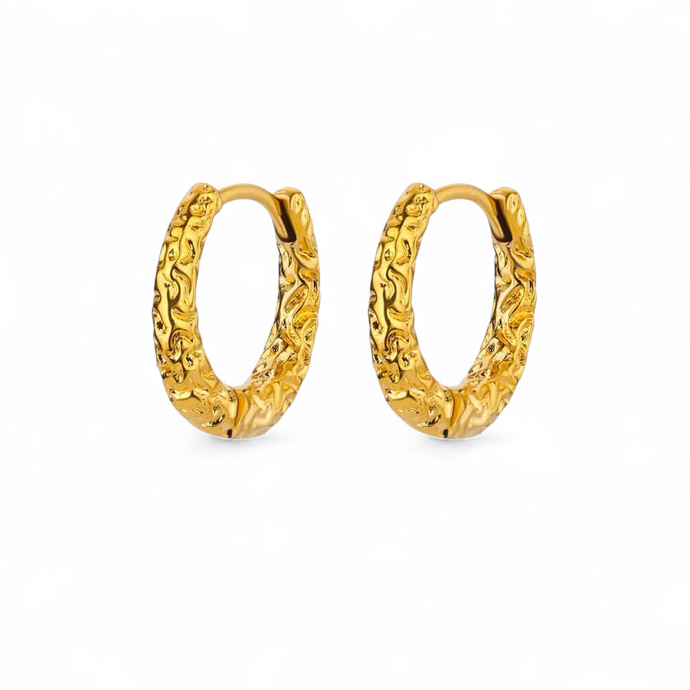 Disse hoops kombinerer klassisk form med et moderne twist. Den smukke, organiske overflade fanger lyset fra alle vinkler og giver et eksklusivt, håndlavet udtryk. Perfekte til både hverdagsbrug og særlige anledninger.