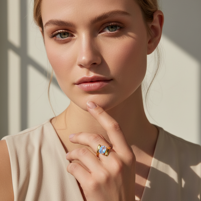 Lad denne elegante ring blive prikken over i’et i dit look. Den er fremstillet i 18kt forgyldt ædelstål og prydet med en funklende, klart slebet zirkon, der fanger lyset smukt fra alle vinkler. Den moderne, bølgede form giver ringen et unikt og eksklusivt udtryk – perfekt til både hverdag og festlige lejligheder.