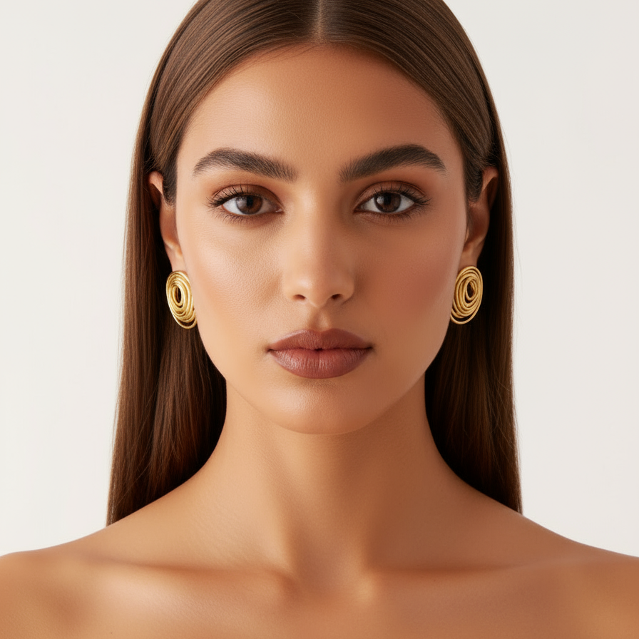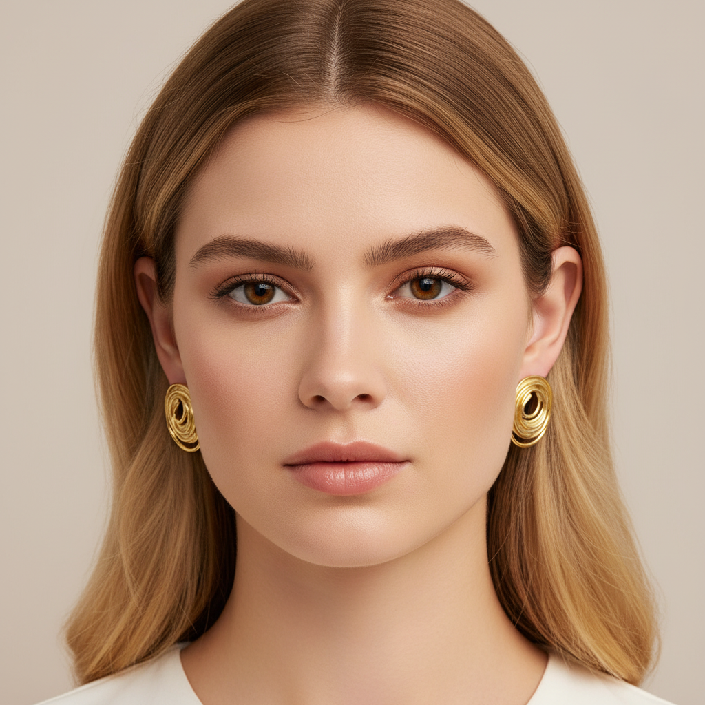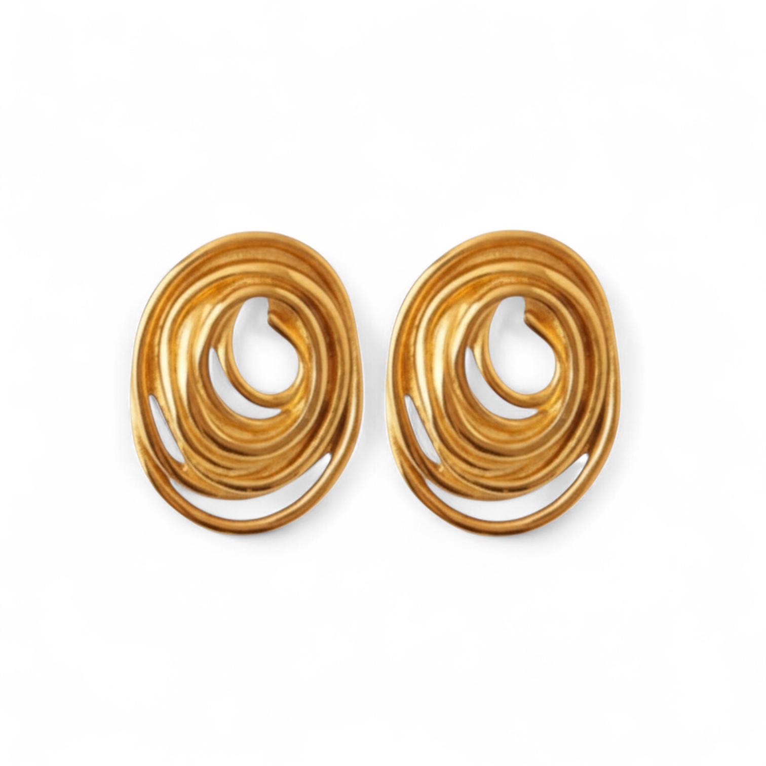 Disse elegante ovale ørestikker skiller sig ud med deres kunstneriske, lagdelte design og blanke guldoverflade. Det organiske formsprog giver et moderne, men tidløst udtryk, der passer perfekt til både hverdag og fest.
