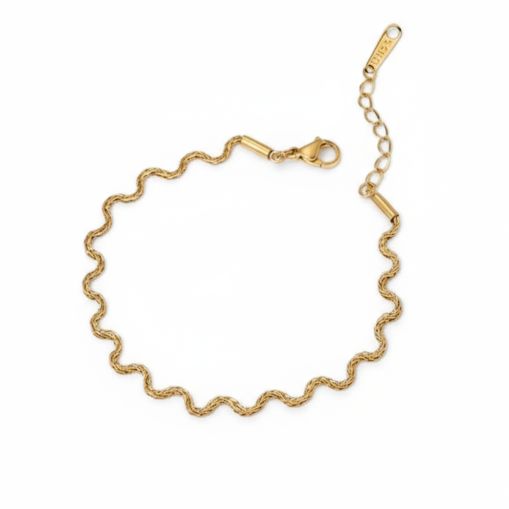 Wave armbånd i 18 karat forgyldt ædelstål med et elegant bølgemønster, der fanger lyset og giver et feminint og moderne udtryk. Armbåndet måler 20 cm + 5,5 cm forlængelse, så det nemt kan justeres til håndleddet.