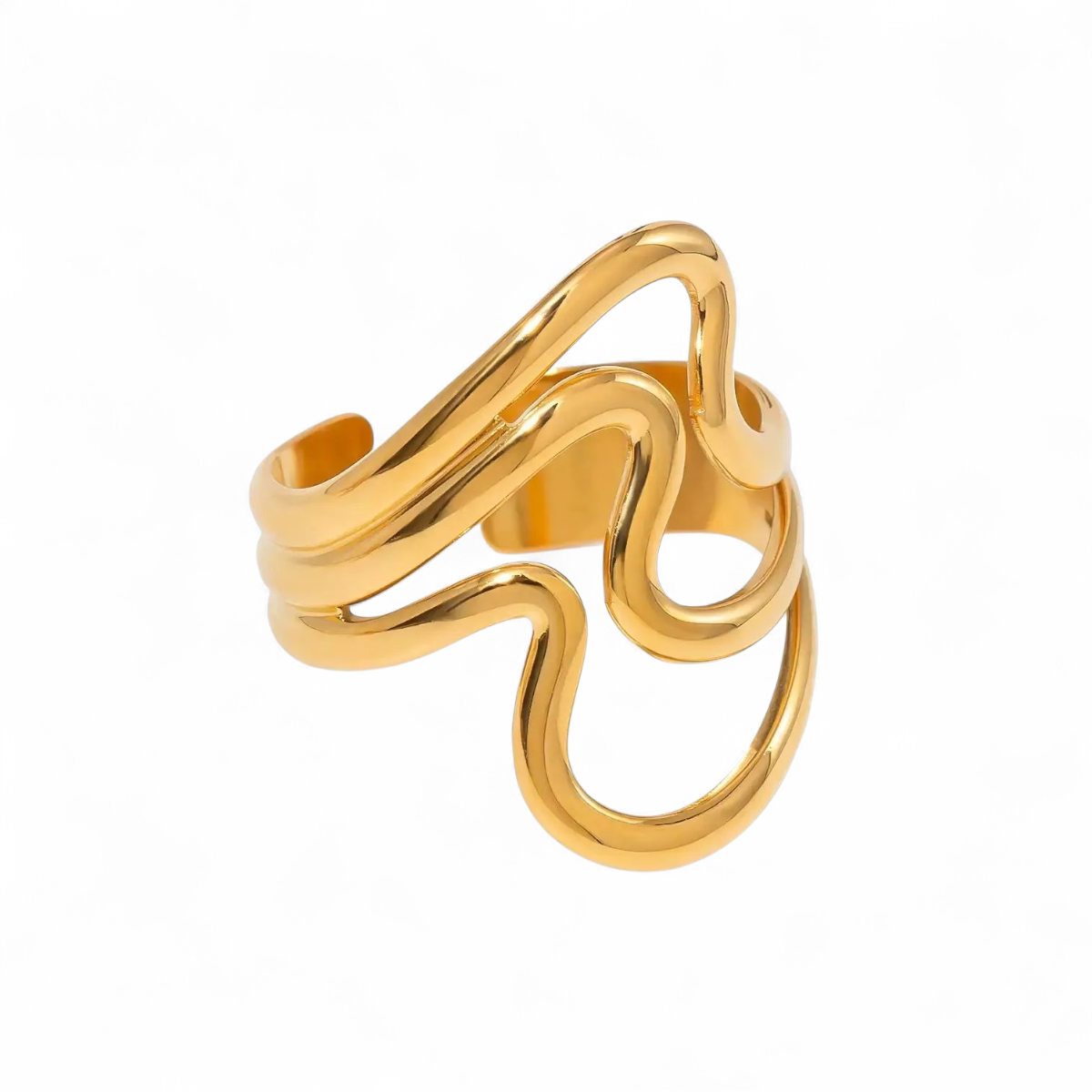 En moderne og iøjnefaldende ring med et flydende, bølgende design, der fanger lyset fra alle vinkler. Den åbne form giver et unikt og kunstnerisk udtryk, samtidig med at den sidder behageligt på fingeren.