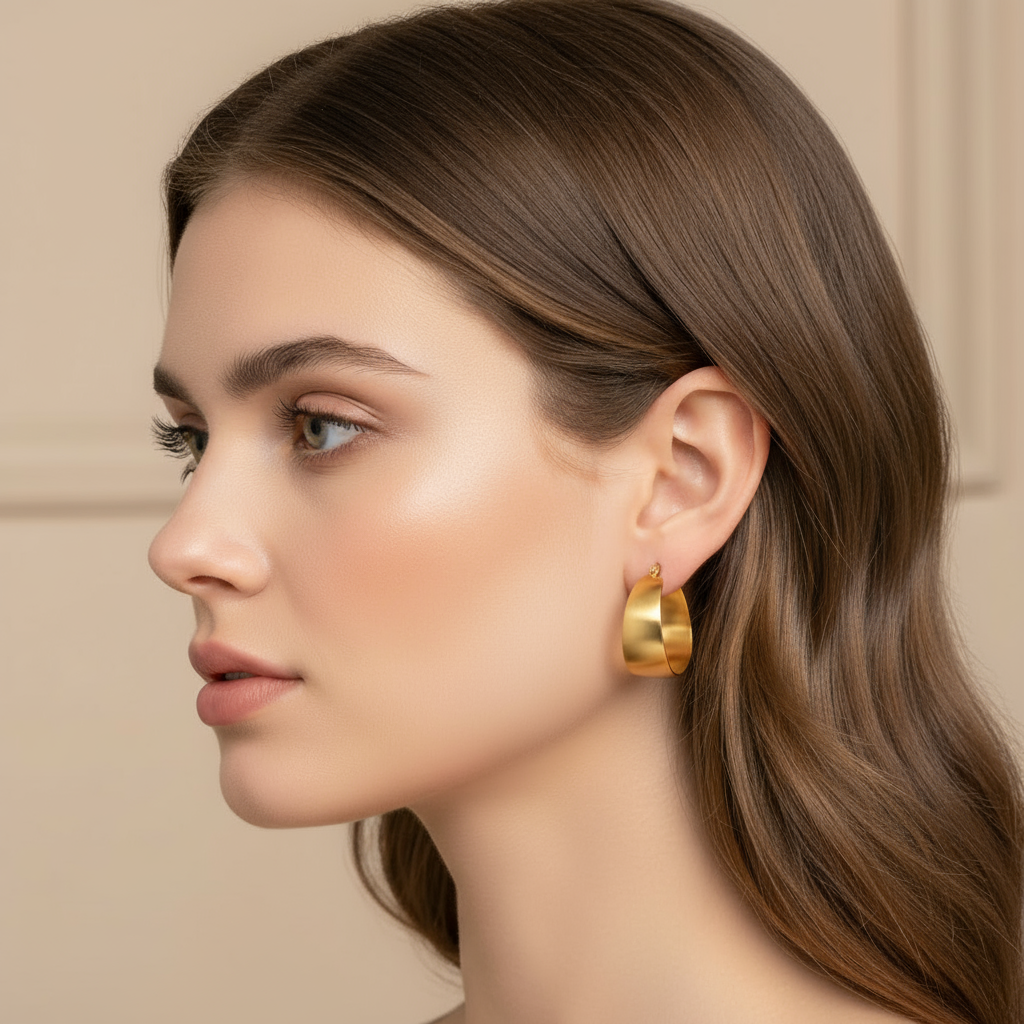 Disse elegante hoops i 18 karat forgyldt ædelstål er det perfekte valg til både hverdag og fest. Den varme guldtone og blankpolerede overflade giver et tidløst, luksuriøst udtryk, der passer til enhver stil – uanset om du bærer dem alene eller kombinerer dem med andre smykker.
